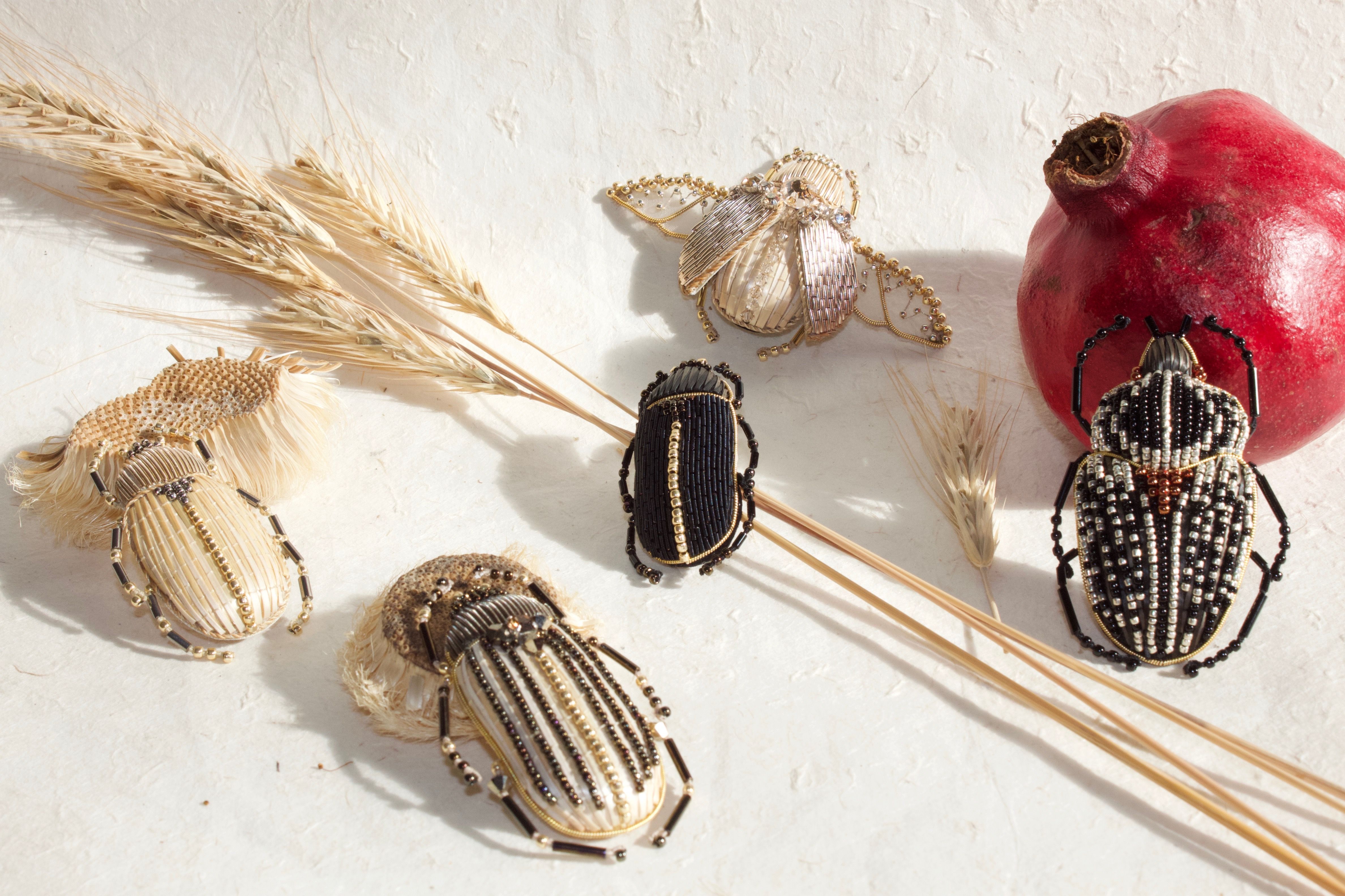 A collection of embroidered brooches, focusing on using natural fibres alongside metallic threads and crystal beads.