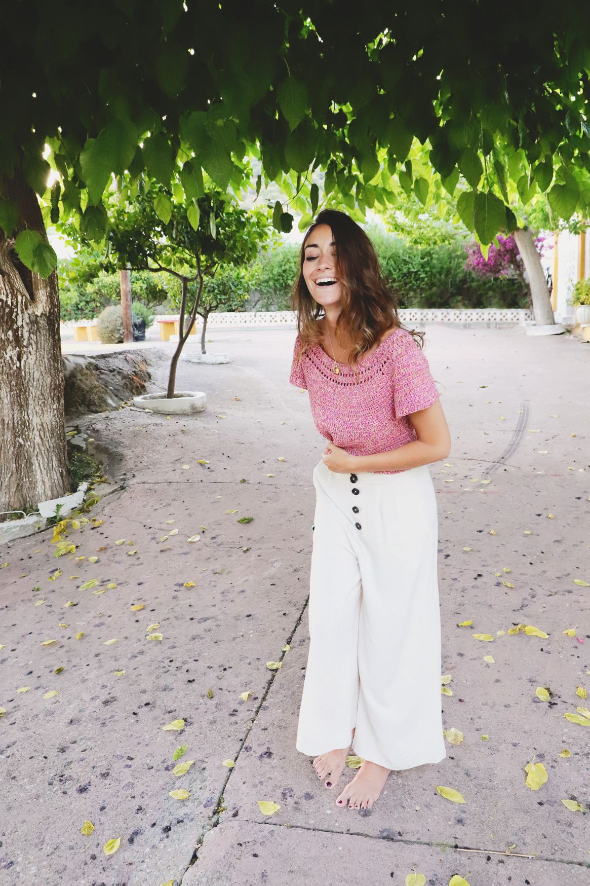 El Top Amelia lleva un calado en la parte superior e inferior, que no le quita sencillez y le aporta un toque distintivo a la prenda.