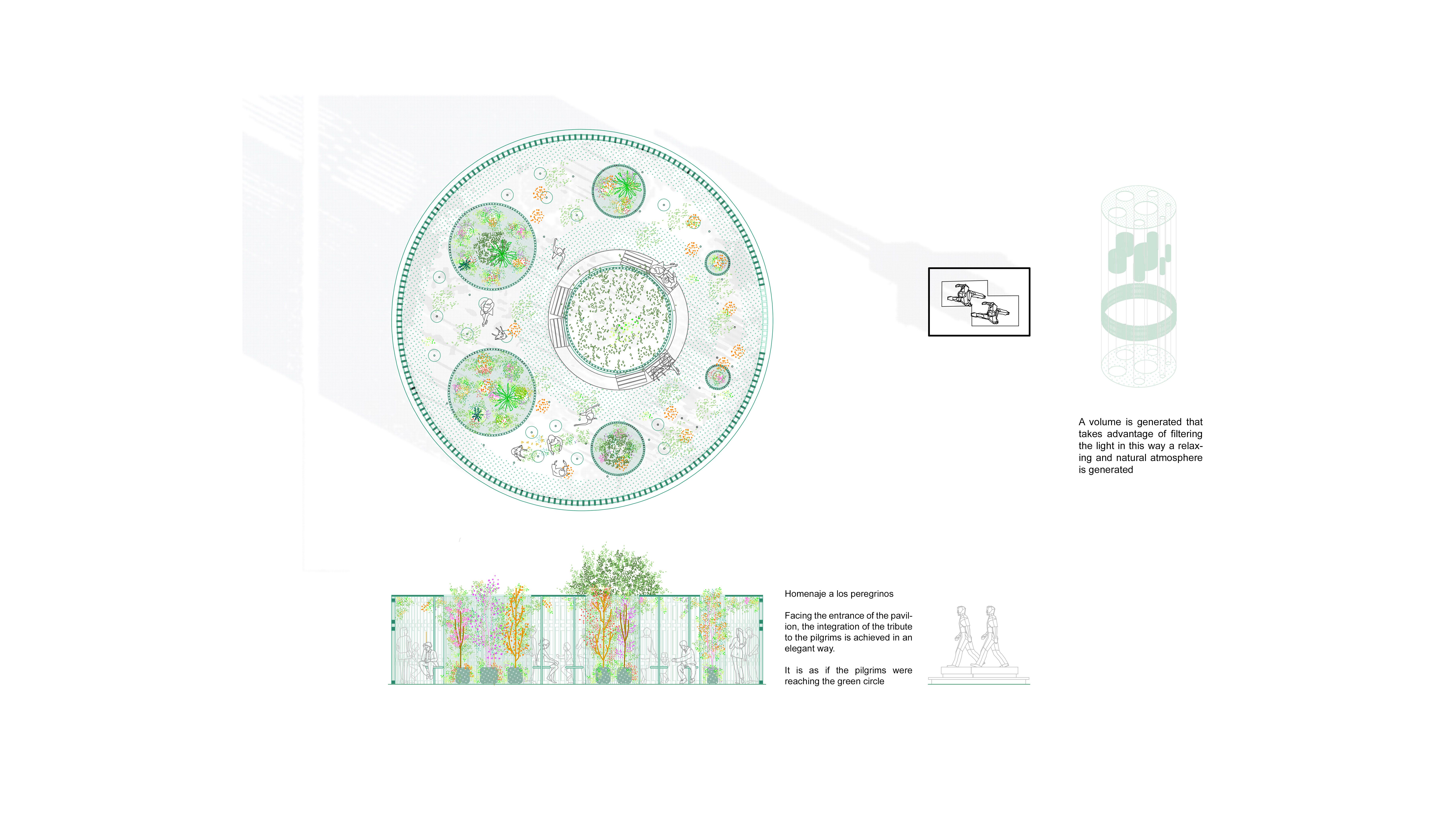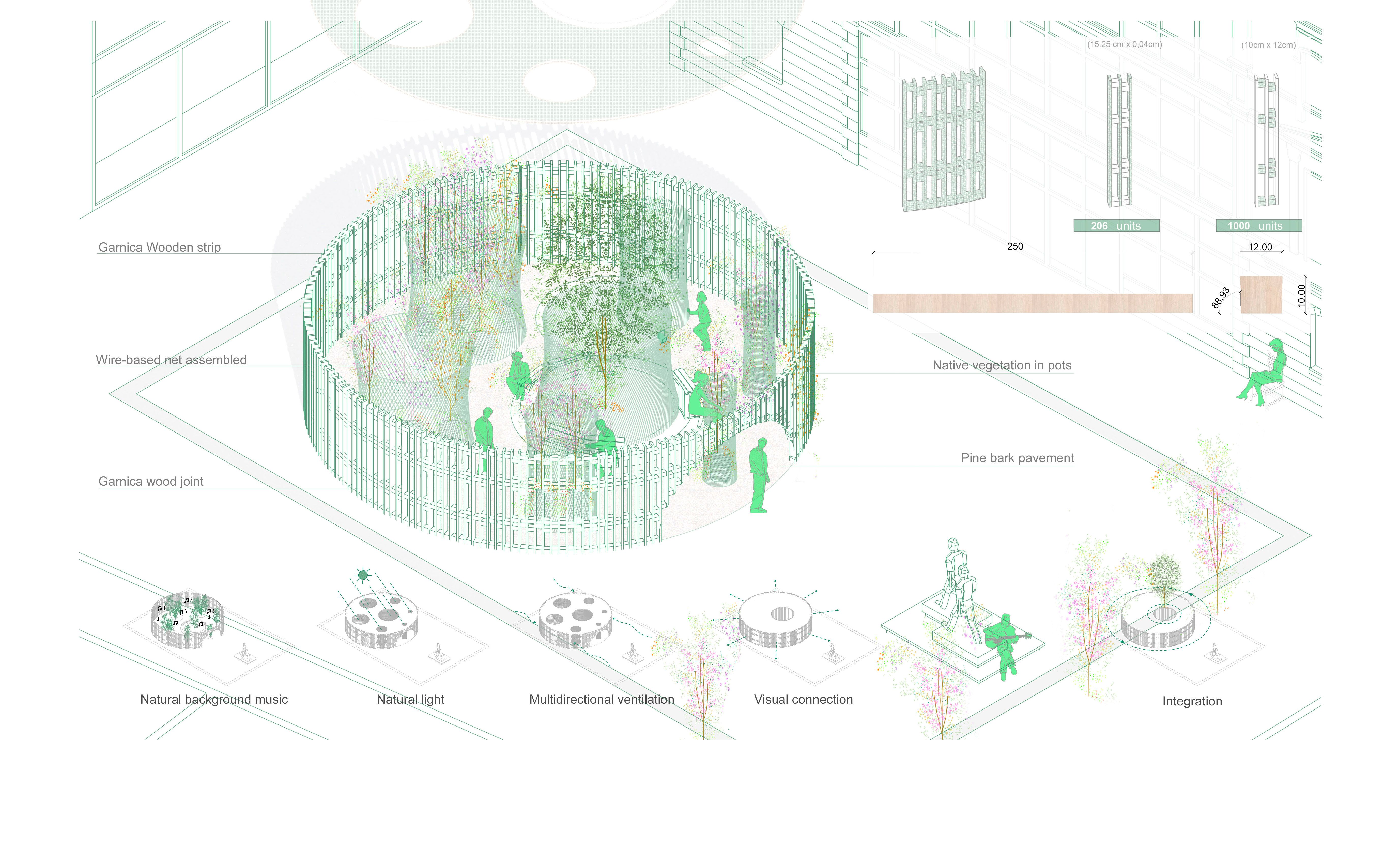 The interior of the Green Circle is understood as a place of disconnection from the city and a return to the primeval natural state, a place where the filtered light and the atmosphere of the little birds makes you achieve a serenity in yourself that reduces stress and generates peace and harmony