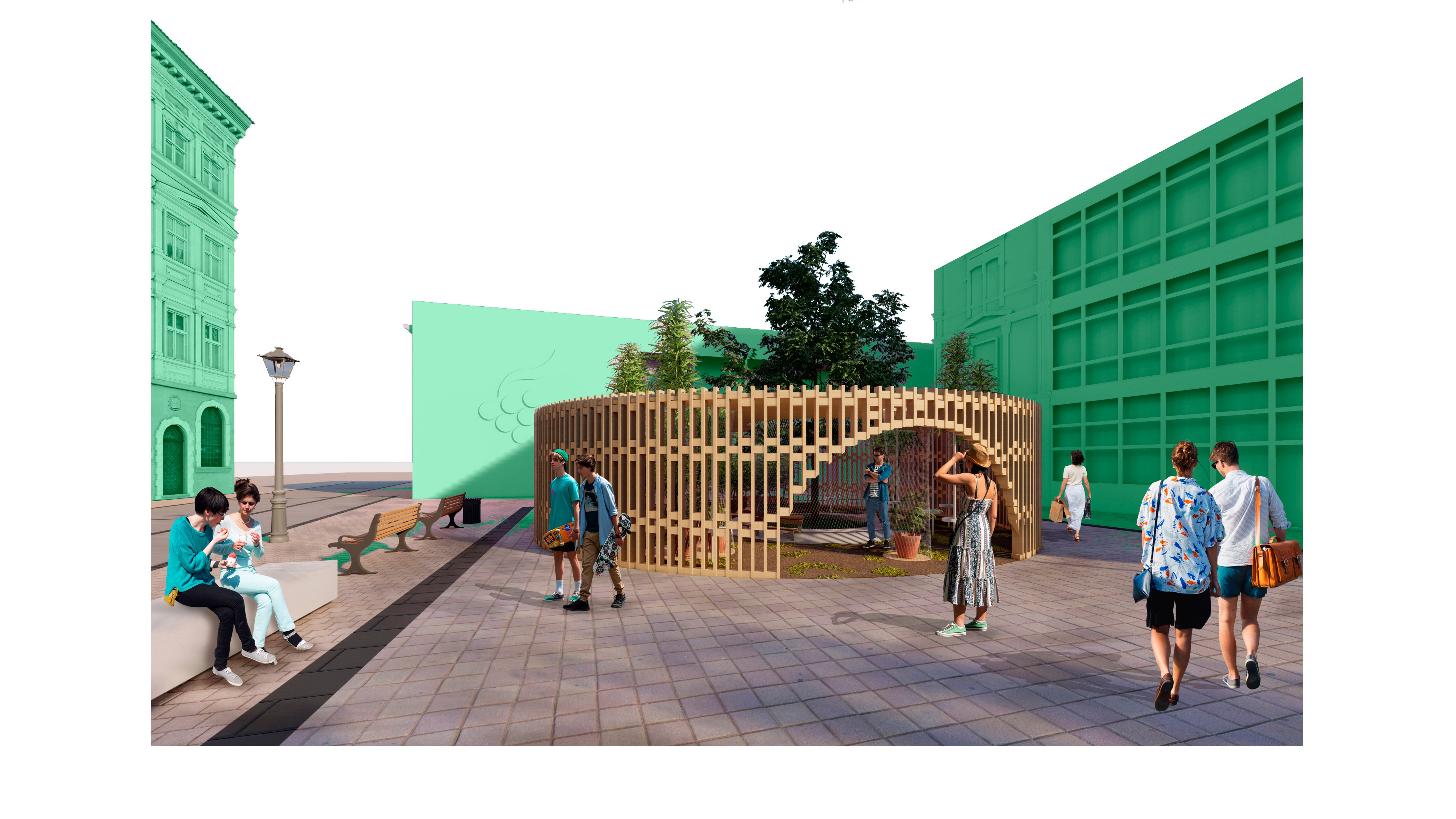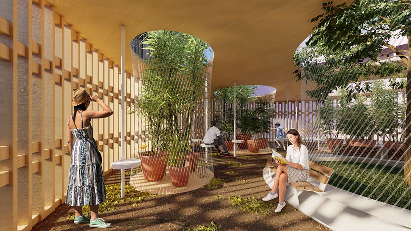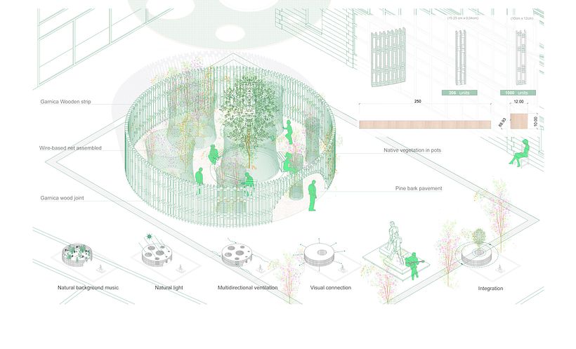 The project is completely removable, trying to filter the light through a lattice generated from laser-cut wooden planks. In addition, it must be incorporated into a circular economy process in which all the materials used are reused for future assembly, reducing the generation of waste to the maximum.