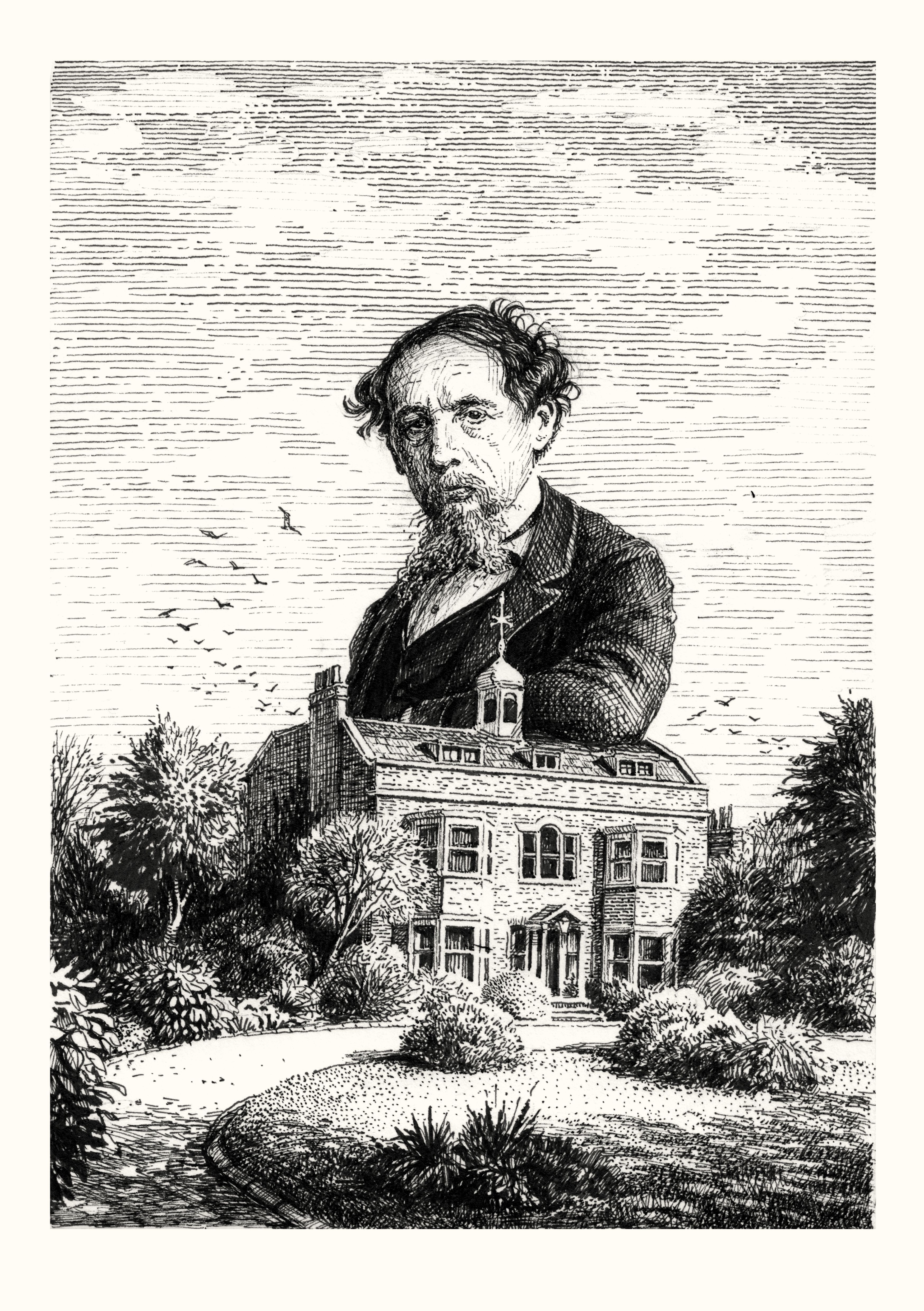 'Literary Houses II' (2021) is a traditional ink drawing project that brings together my two passions, architecture and literature, with a surrealist twist - oversized portraits of great authors of literature, towering over the houses they lived in.