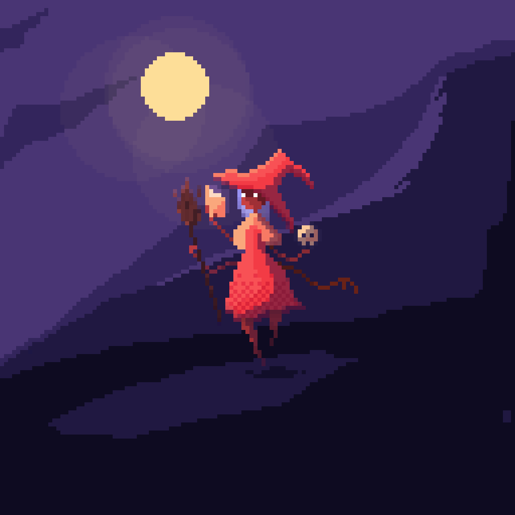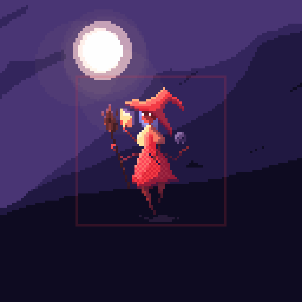 Este diseño de personaje esta basado en varias ilustraciones que encontré en internet. Batallé con la selección de color, y al final opté por basarme en los colores de otra ilustración, jeje. El dithering y el anti-aliasing los repetí varias veces, aun no se si lo haya aplicado bien, pero el resultado final me pareció bueno... ojalá no se complique en animación, quizás me sobrepasé con los detalles. Siento que al fondo le falta muchiiisimo, pero el objetivo era el personaje, así que lo voy a dejar pasar.