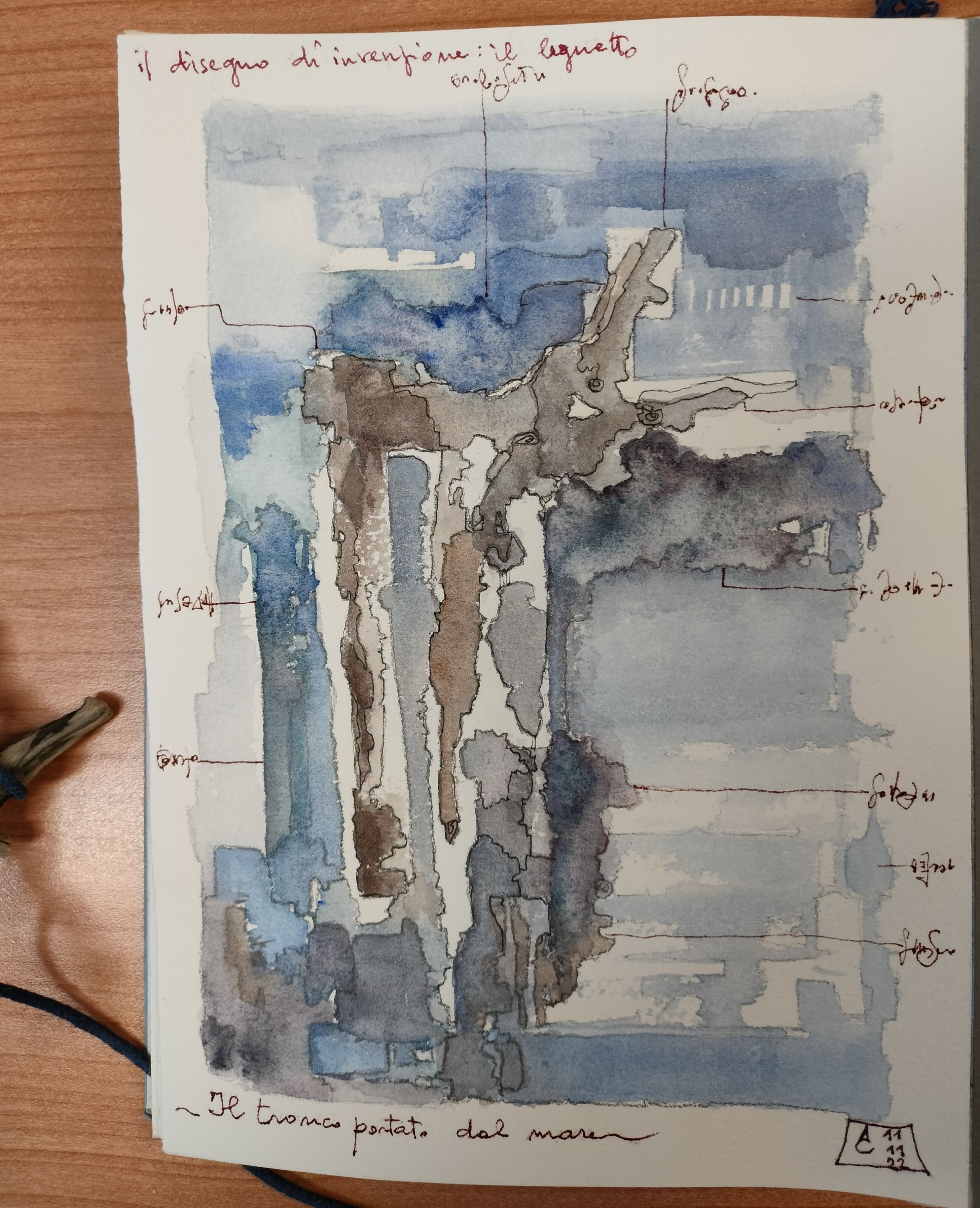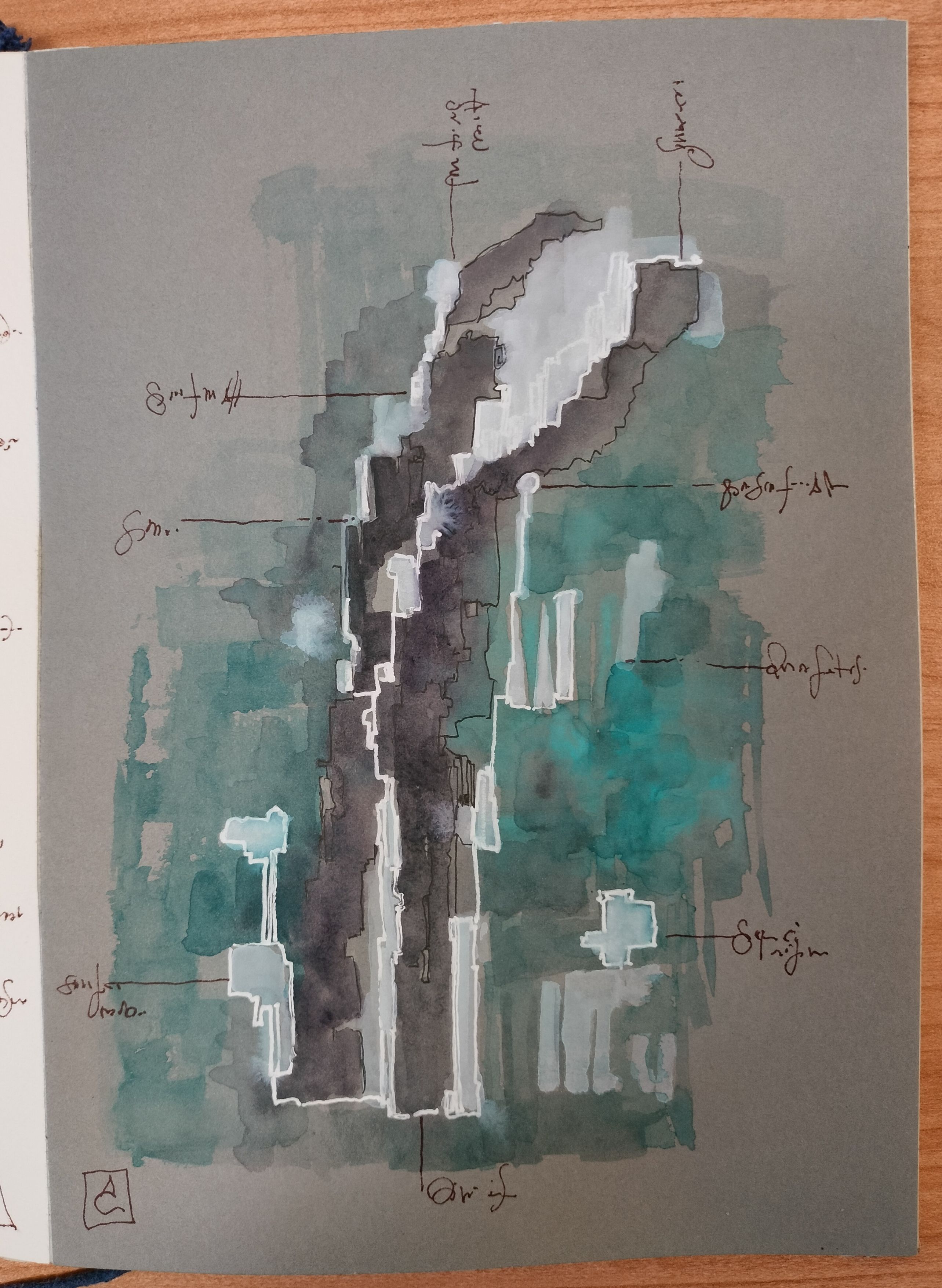 Seguo Claudio Patanè su FB da un po' di tempo e sono affascinata dai suoi disegni con luoghi fantastici dipinti con un tocco leggero di acquerello e misteriose scritte. Così come ho visto il suo corso mi sono subito iscritta e lentamente ne ho assaporato tutti gli stimoli. Inevitabilmente dovendo scegliere un’immagine sono andata nel luogo del mio cuore che è l’isola di Procida. Del corso mi è piaciuto tutto e in particolare ho molto apprezzato l’esercizio di inventare frammenti di città da semplici campiture di colore e…non mi sono più fermata. Ora gli ho dedicato uno specifico taccuino e inserisco scritte immaginarie e liberatorie, un’altra magia…un’altra scoperta: la scrittografia - quando il disegno si fa parola…