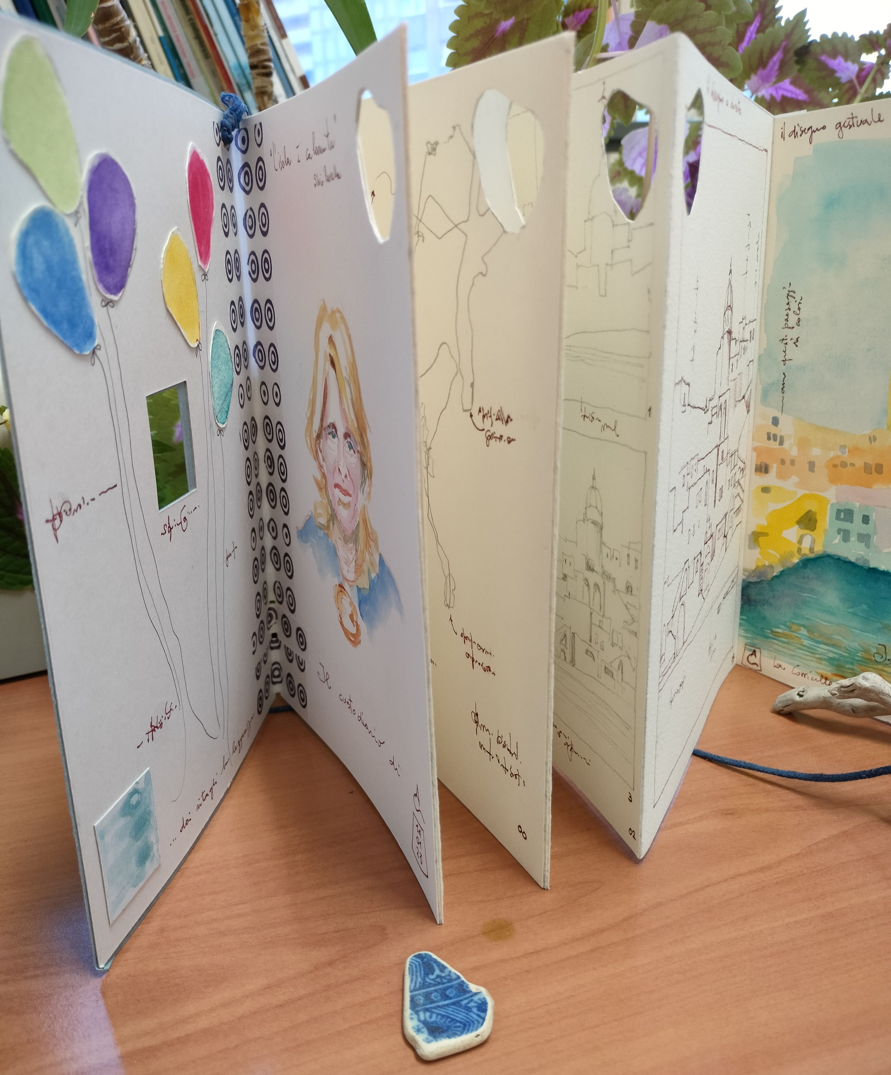 składany pamiętnik „akordeonowy” (Leporello) jest materialnym i czasowym przedłużeniem graficznej opowieści. Rodzaj narracji poprzez nieograniczoną liczbę obrazów widocznych na pojedynczych klatkach lub poprzez czytanie w ruchu, jak w kinie.