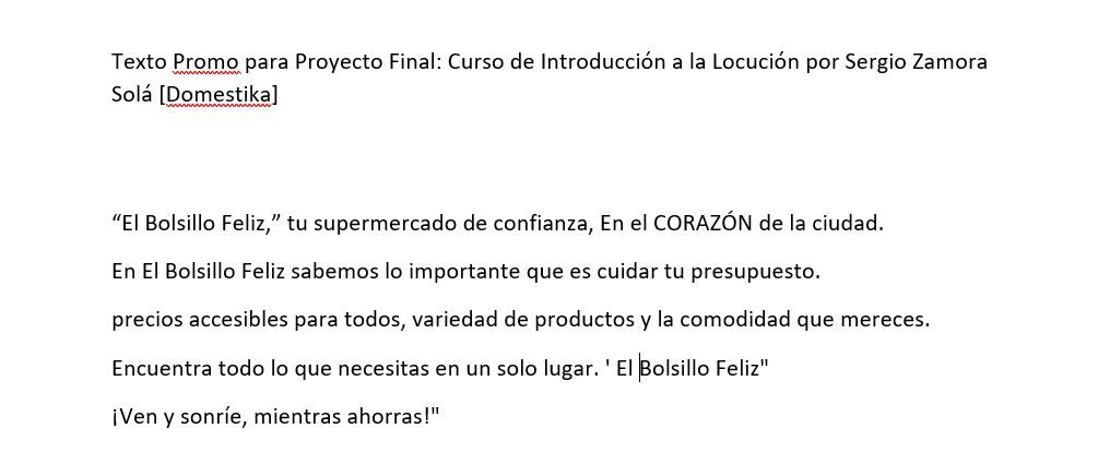 En esta primera parte he realizado el texto de mi locución, decidí que ésta sería de un Supermercado considerando el auge que los supermercados y/o Minimarkets están tomando en la zona donde resido. Así que tomando de referencia ésta idea he trabajado "El Bolsillo Feliz" un Supermercado Ficticio que está por lanzarse. (Imagen Adjunta del Texto Redactado)