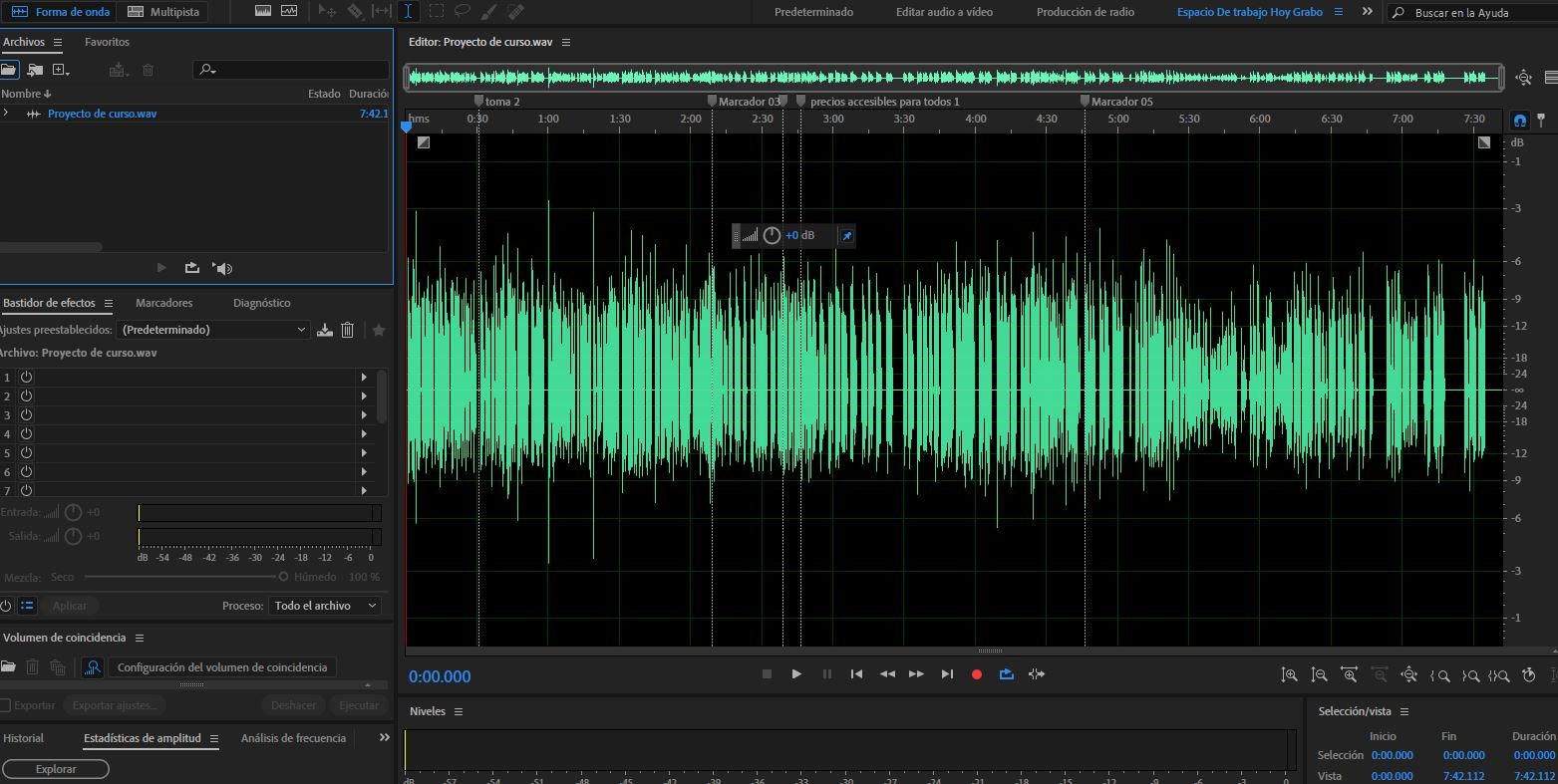 Para este punto del Proyecto Final, con mi locución editada ayudándome de algunas habilidades que había aprendido para usar el Adobe Audition. Pese a tener áreas de oportunidad en este arte de la locución, mi intención era que sonora lo mejor posible así que me he auxiliado de las herramientas del DAW para ello.