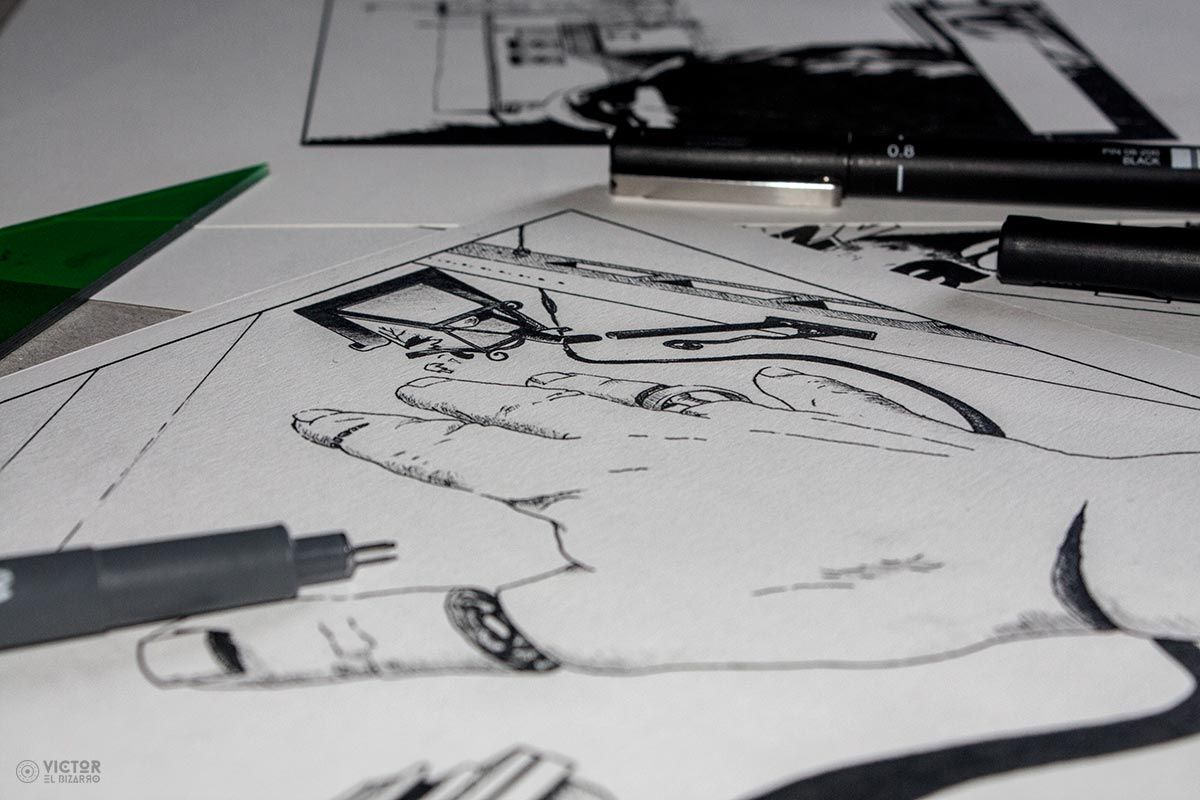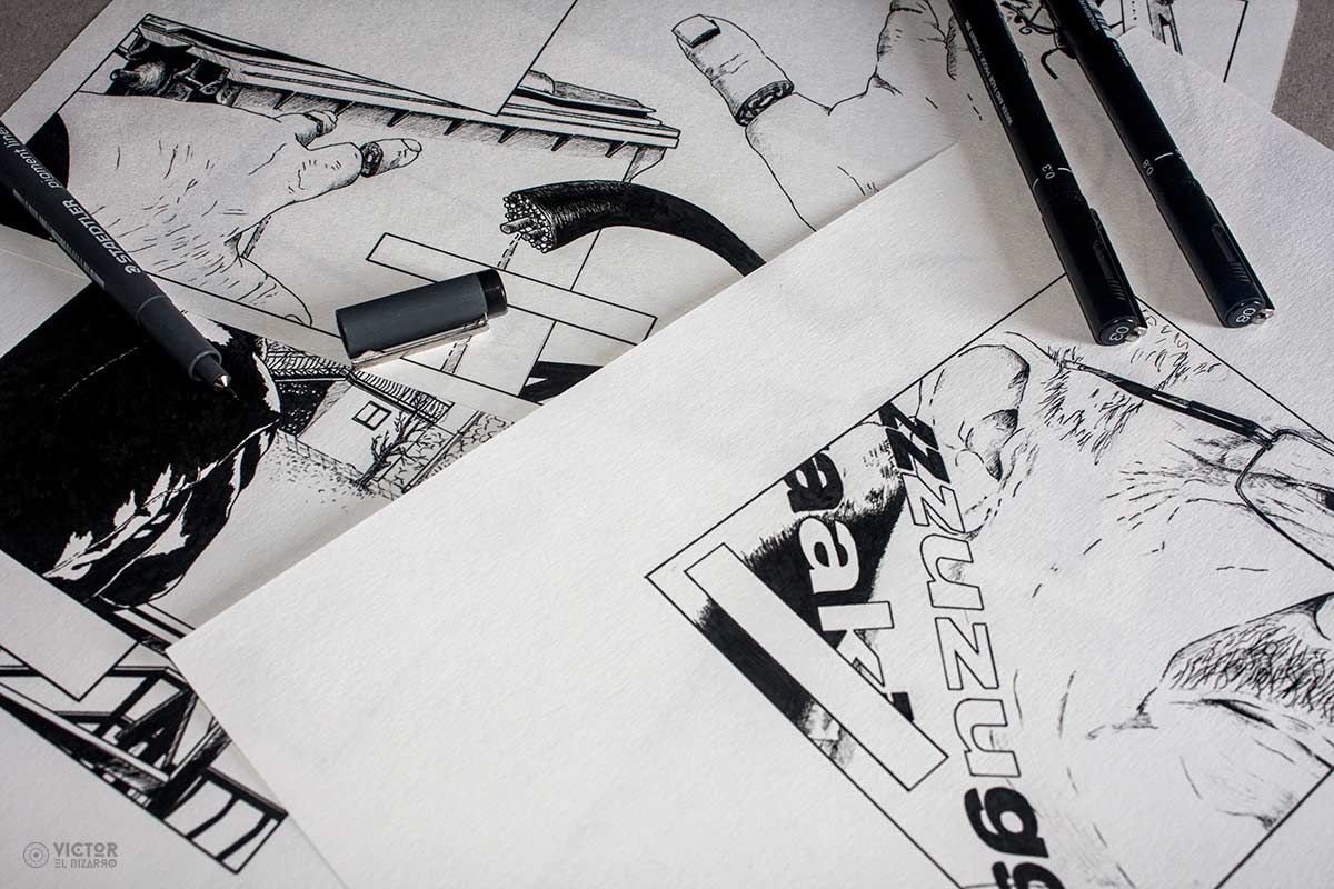 Ilustraciones realizadas a mano con rotuladores de punta fina (0.2, 0.3 y 0.8) sobre papel Muguruza de 80gr.