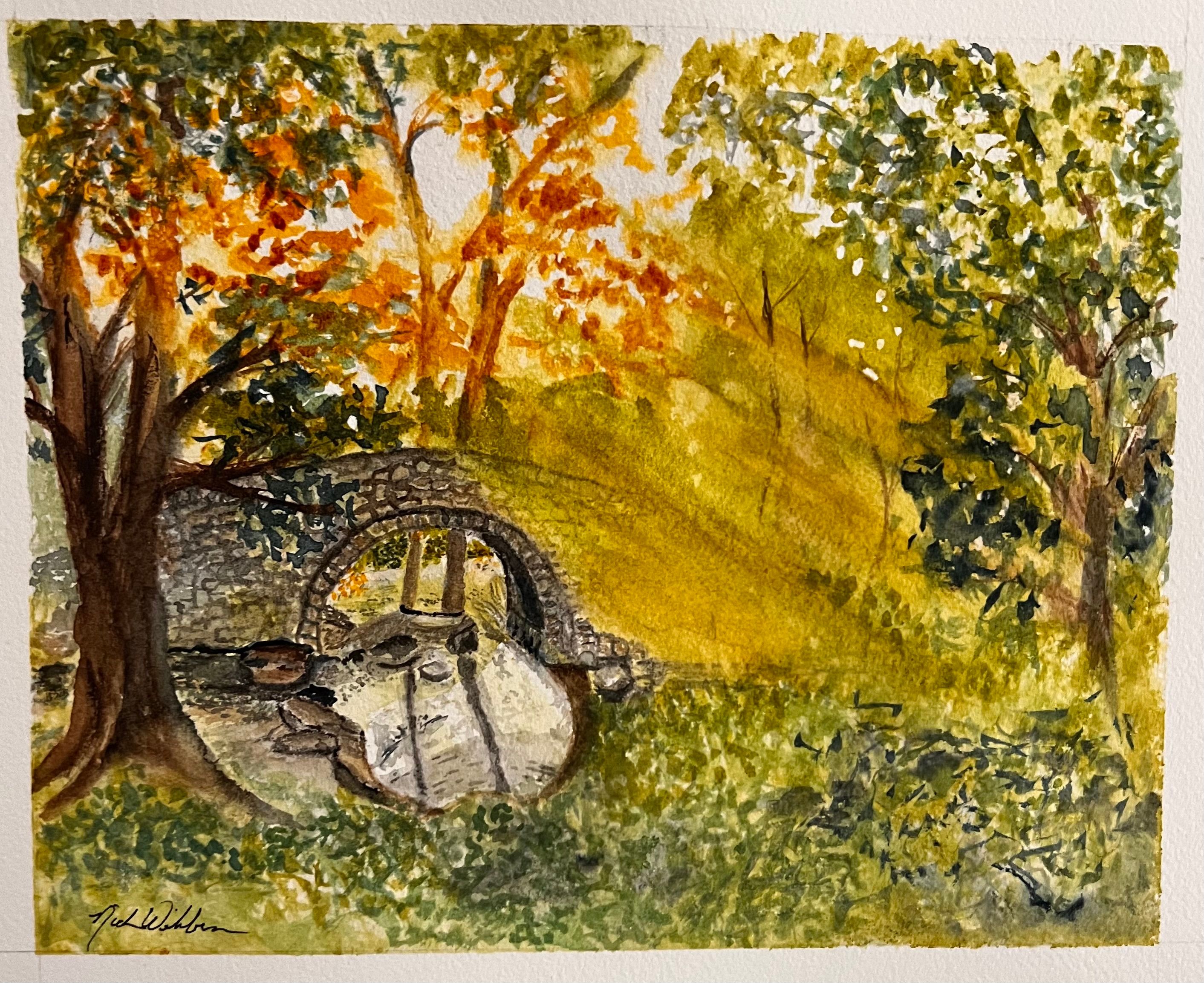 I deviated frrom my original sketch and moved the footbridge to the left and decided not to have as many trees. I may revisit my orignial sketch. I got so excited once I began painting and forgot to take photos of paper preperation and underpaintings. I see the importance now of a daily writte journal for future project and to note failures and successes. I am looking forward to comments and suggestions.