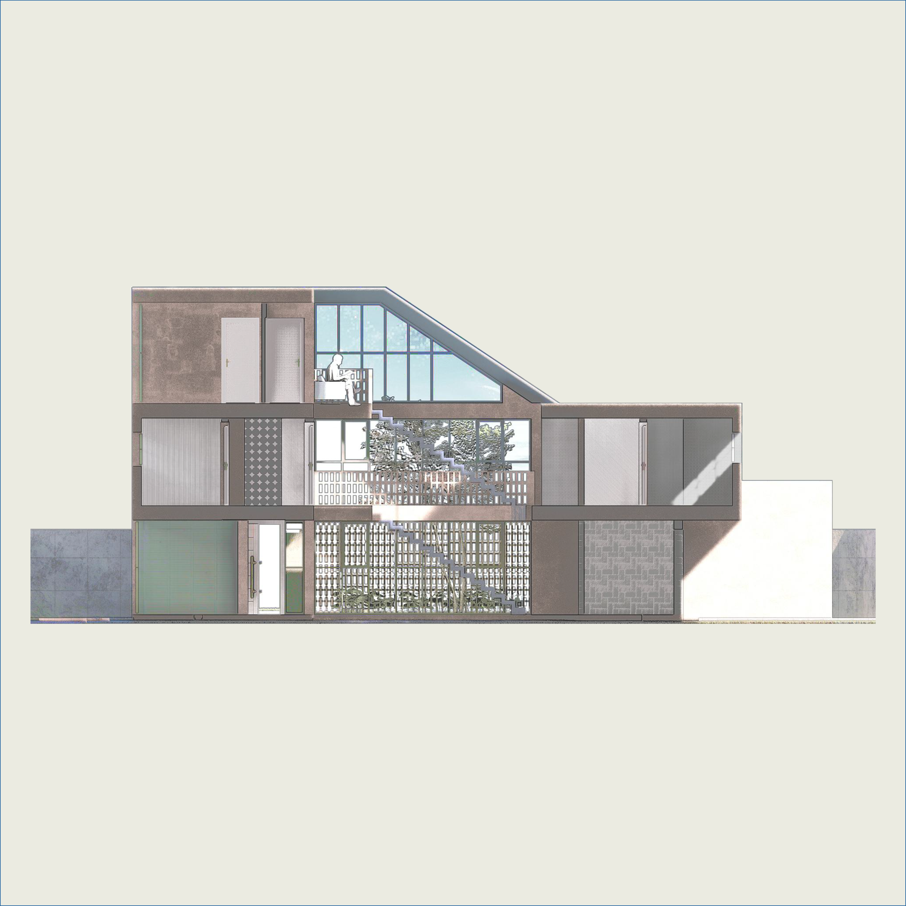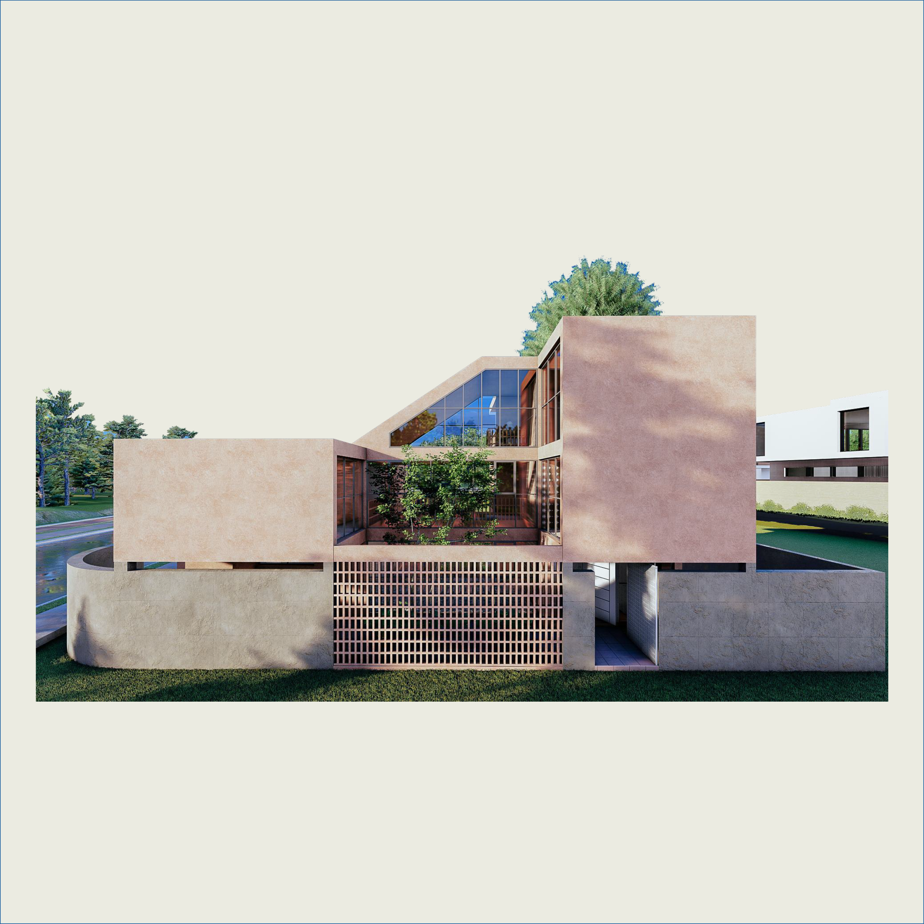 Projekt ten przedstawia dom rodzinny zaprojektowany w nowoczesnym stylu. Główna konstrukcja łączy w sobie elementy z odsłoniętego betonu w odcieniach czerwieni, co nadaje jej ciepły, solidny i nowoczesny wygląd. Projekt architektoniczny wykorzystuje interakcję przestrzeni otwartej i zamkniętej, tworząc płynne połączenie wnętrza z zewnętrzem.