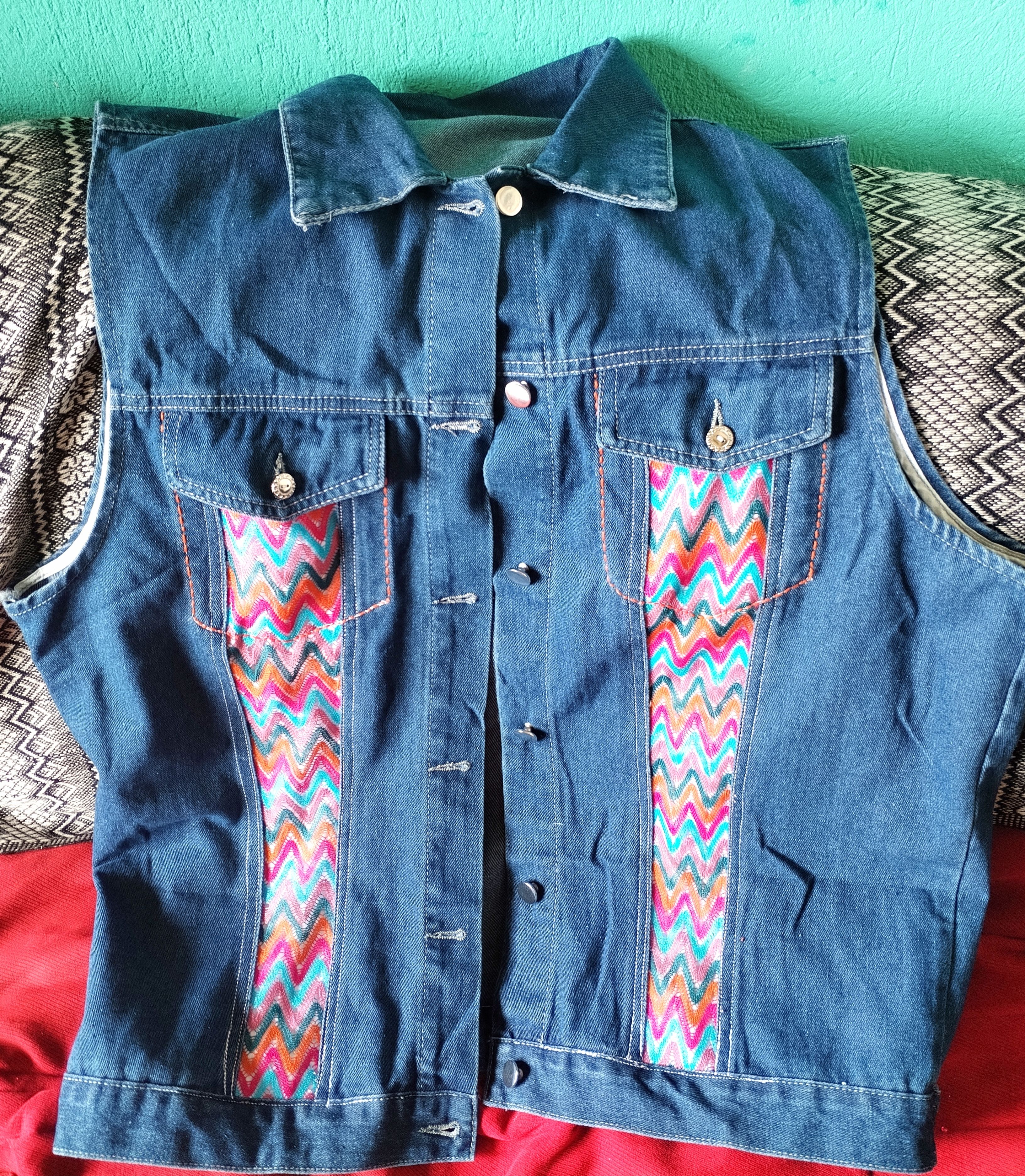 Intervención de un chaleco de mezclilla, con tela étnica un una costura sencilla a mano.
