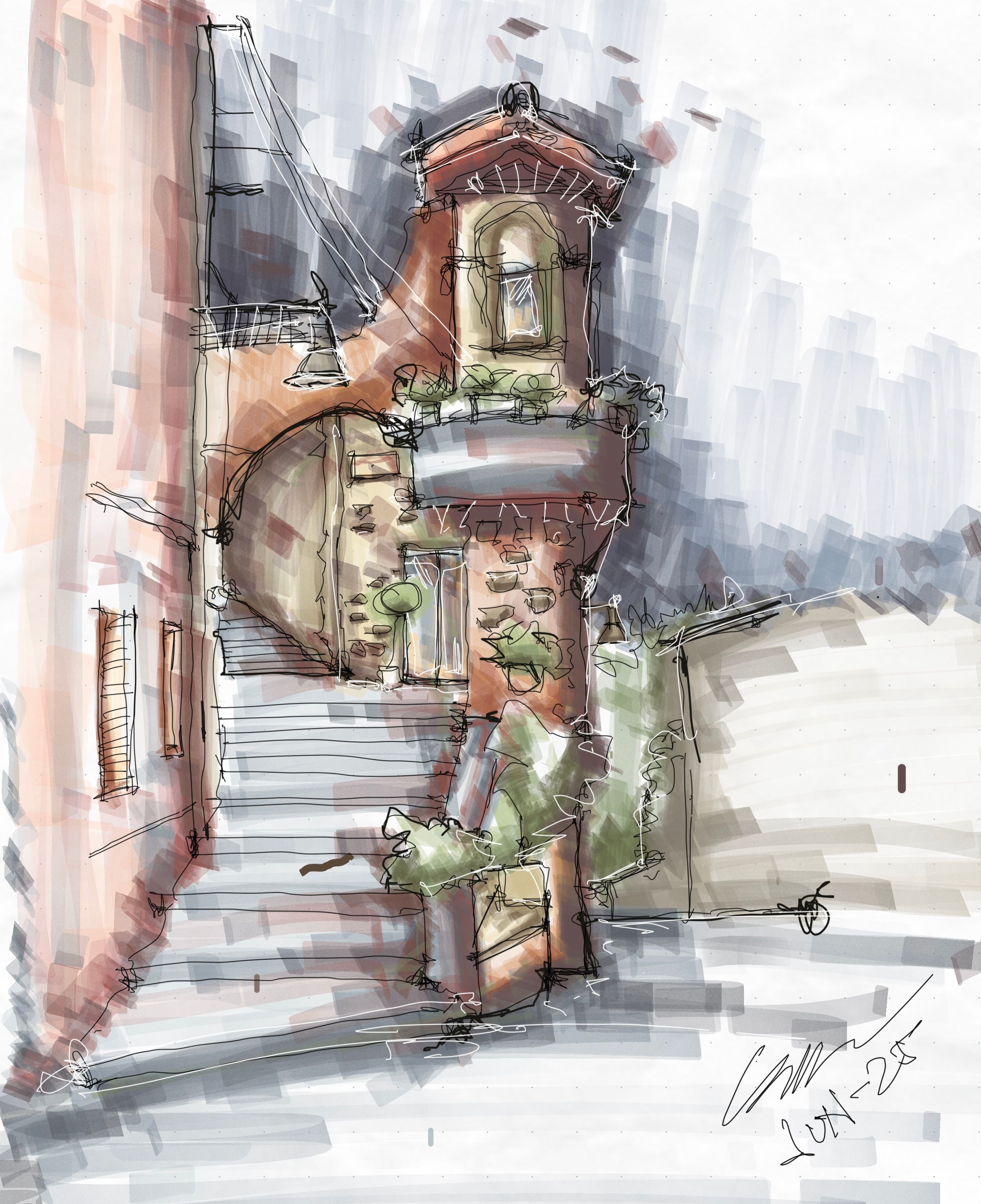 Me basé en una imagen de referencia de una calle con arquitectura típica italiana, con escaleras, texturas en ladrillo y detalles vegetales. En el momento de realizar el proyecto no contaba con los marcadores físicos recomendados en el curso, por lo que decidí desarrollarlo de forma digital desde el iPad, tratando de mantener la esencia del trazo manual y la expresión del color. El objetivo fue aplicar las técnicas vistas en clase desde otro medio, explorando cómo adaptarlas al entorno digital sin perder el estilo expresivo.