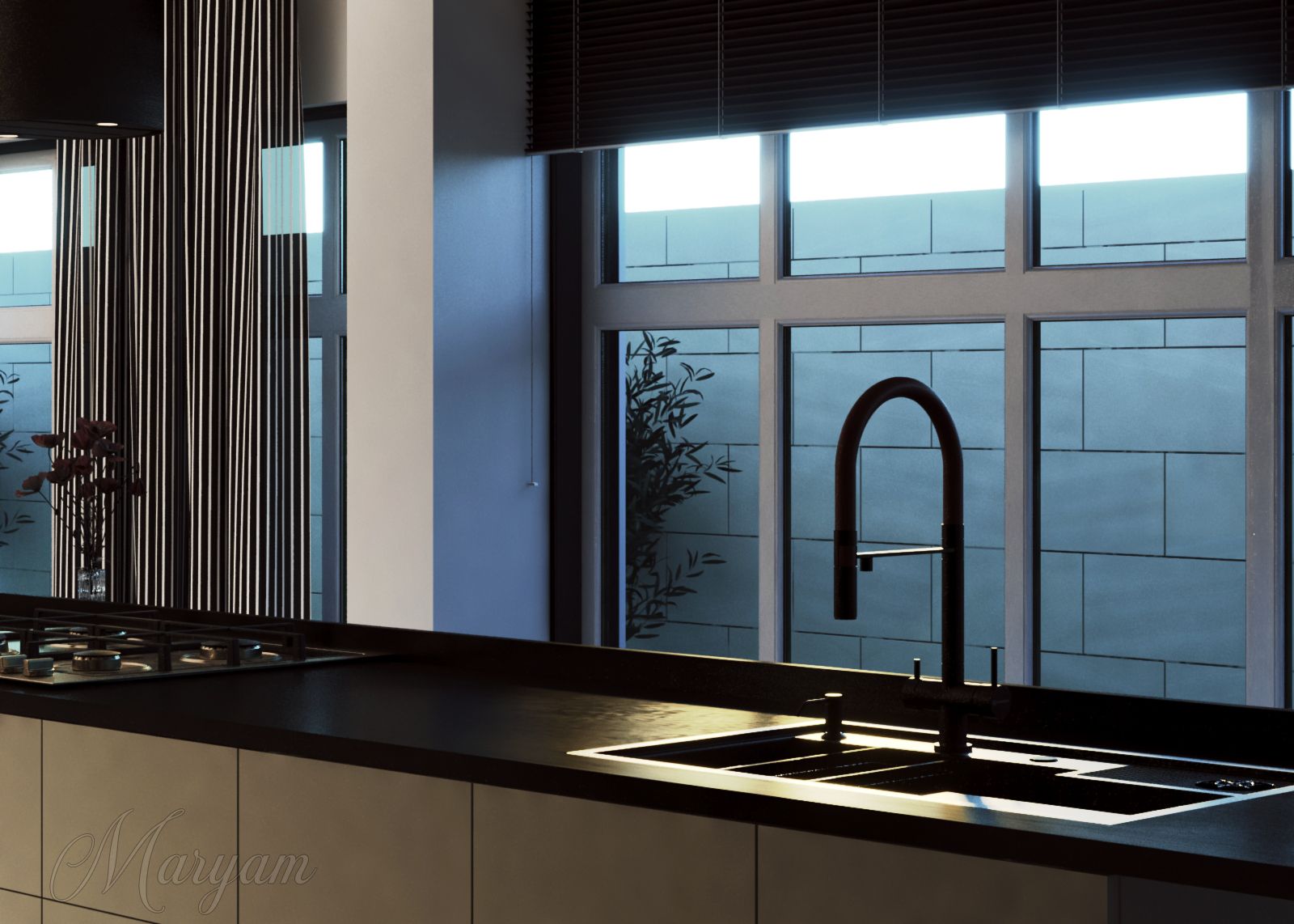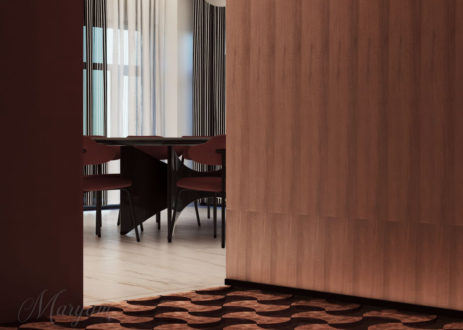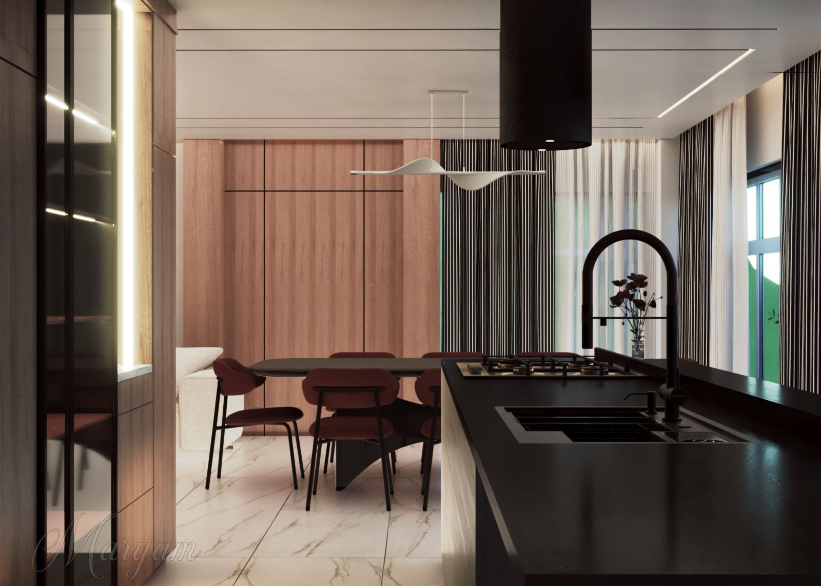 The general planning is based on an open-floor layout that seamlessly connects the kitchen, dining, living room and the main entrance, creating a fluid and cohesive living experience. The design focuses on visual balance and modern elegance through the use of warm textures, rich earthy tones, and minimal yet striking elements. The dark touches added a depth and a contemporary touch, while the carefully selected lightning fixtures enhance the overall sophistication of the space. Clean lines and subtle details bring harmony, making the space feel both functional and inviting.