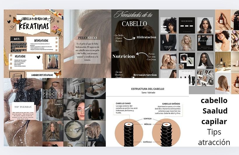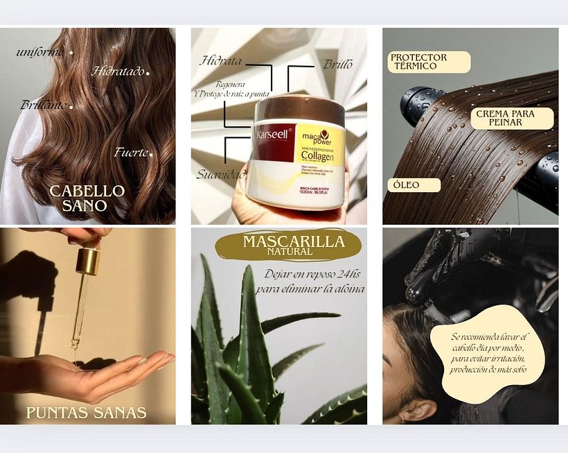 Las imágenes son limpias y de alta calidad, mostrando texturas de cabello, productos y elementos naturales (como el aloe vera o el gotero de aceite).