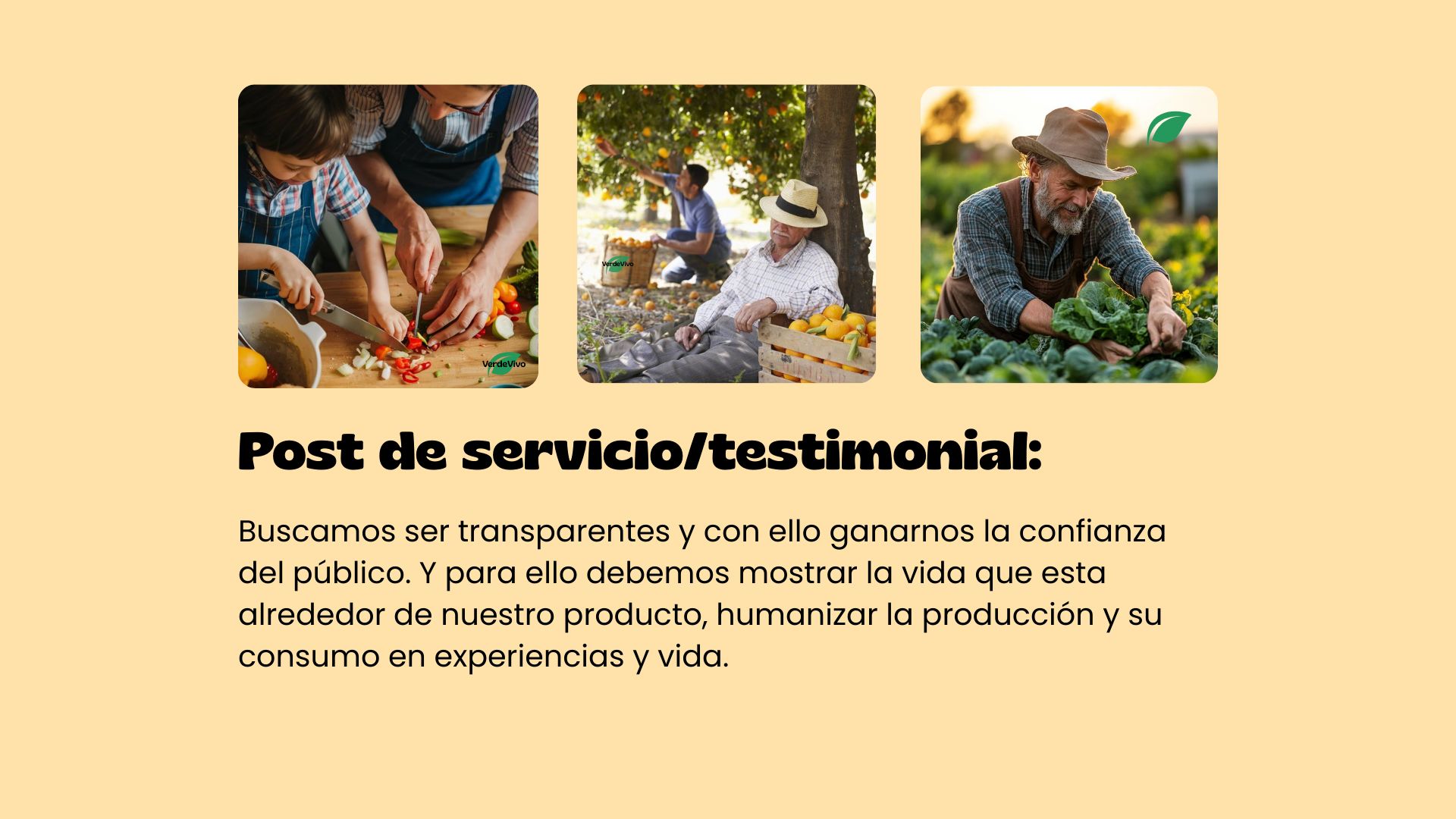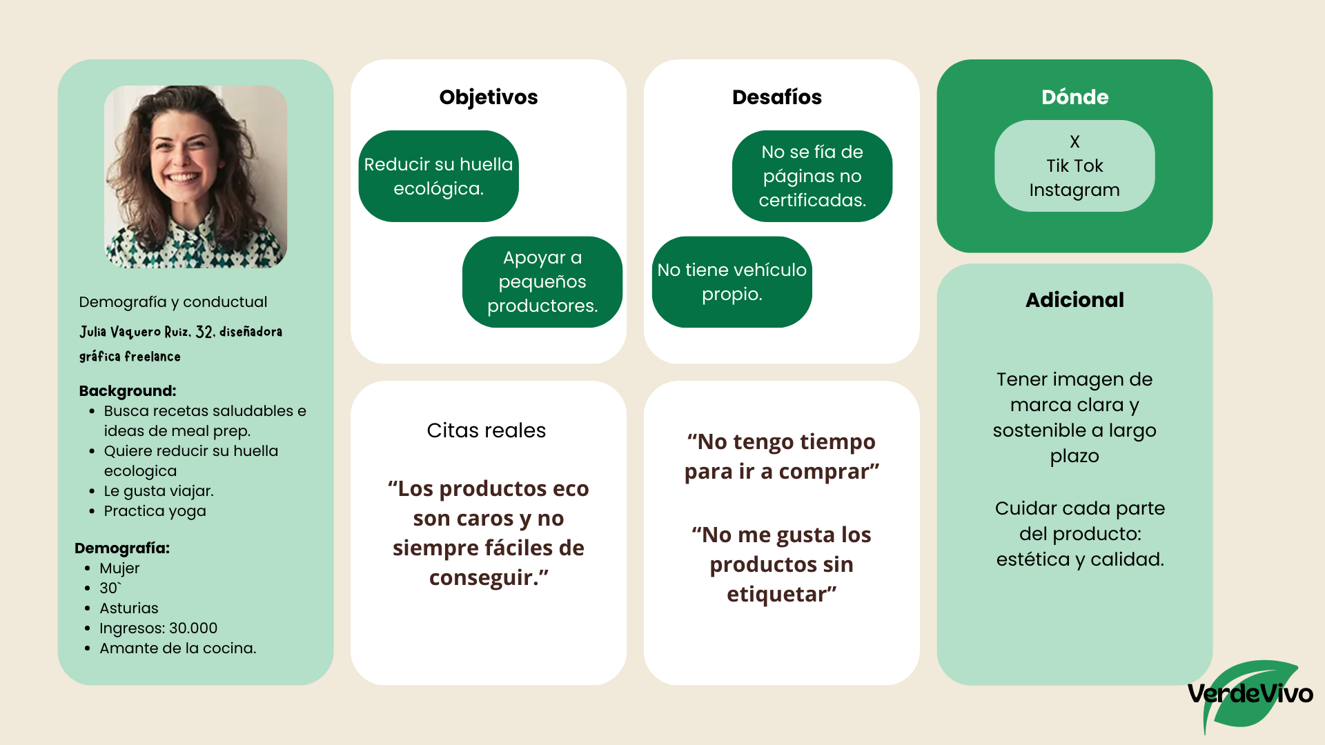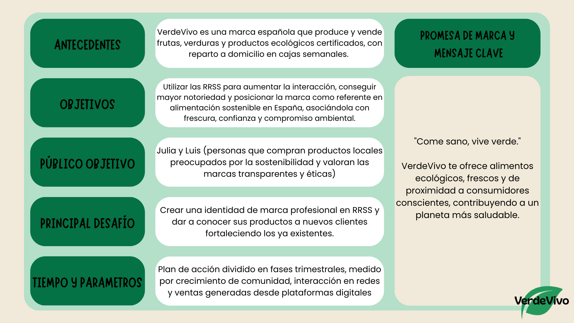 VerdeVivo es una marca española que produce y vende frutas, verduras y productos ecológicos certificados, con reparto a domicilio en cajas semanales. Su objetivo es fomentar el consumo responsable, apoyar a pequeños agricultores locales y reducir el uso de plásticos.
