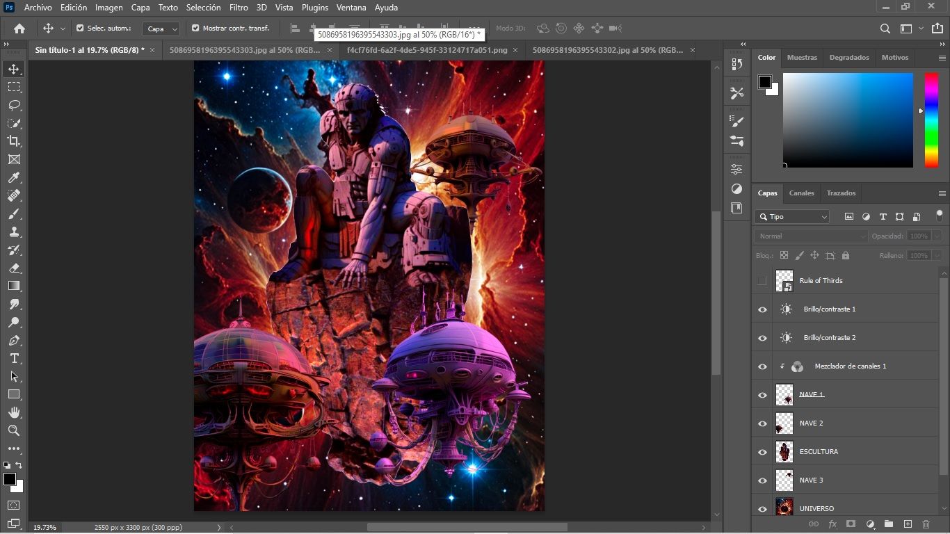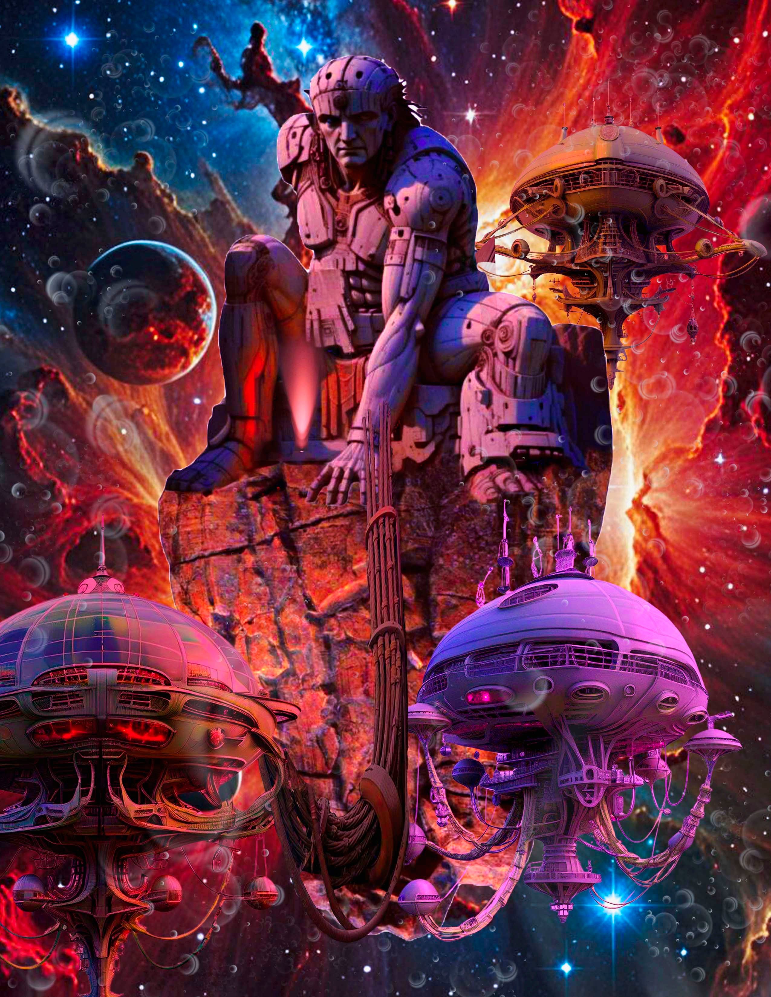 Es un collage digital modificado en Photoshop Quise hacer una ilustración espacial de un coloso aprisionado por una civilización