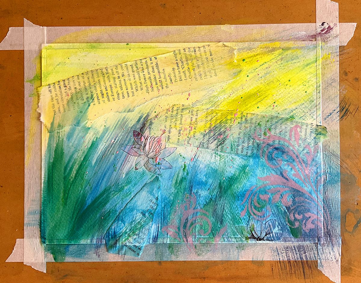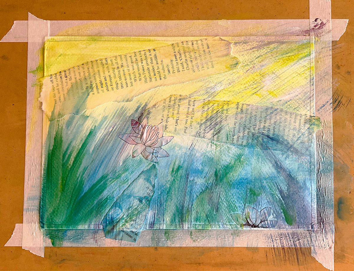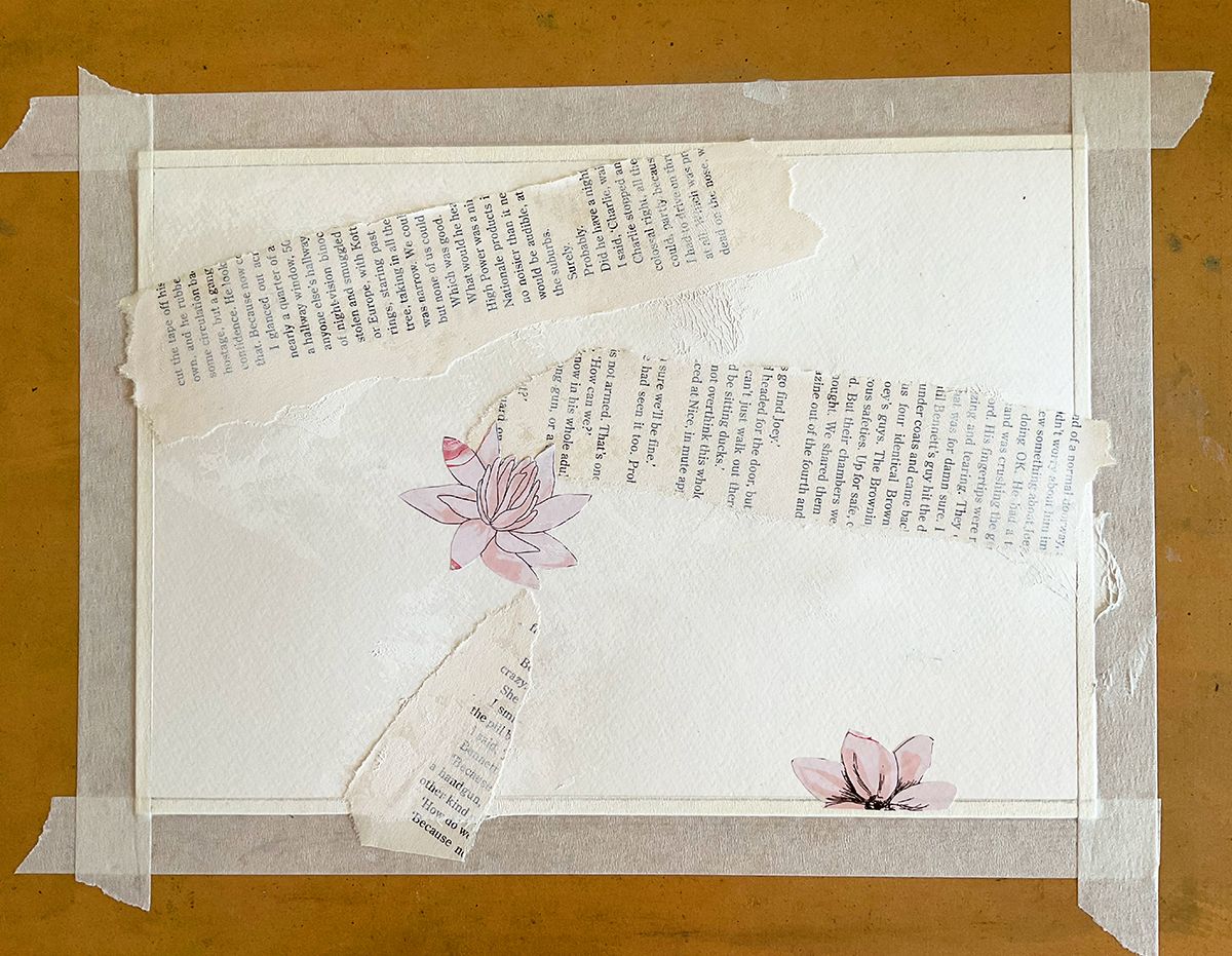 Glue the strips of old print and floral elements onto the paper. Use some white gesso to lightly paint out the printed words on the paper. The reason for this is to make the printed words less obvious.