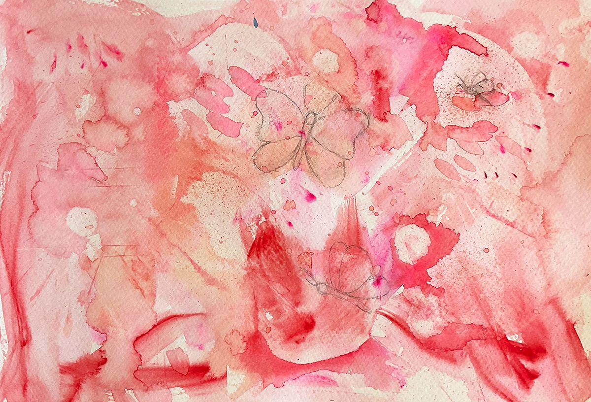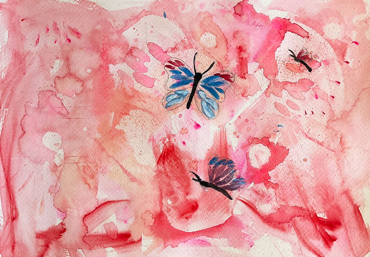 In this stage, create an abstract page using any colour you want. Be loose and spontaneous. You can use other tools besides paint brushes such as credit cards, kitchen utensils, sticks etc to make abstract marks. Allow the artwork to dry. When the artwork has fully dried, draw the shapes of butterflies in pencil. Next paint colourful patterns on the wings of the butterflies. Paint the body and antennas in black paint. When the artwork is dry, cut out the butterflies using small sharp scissors.