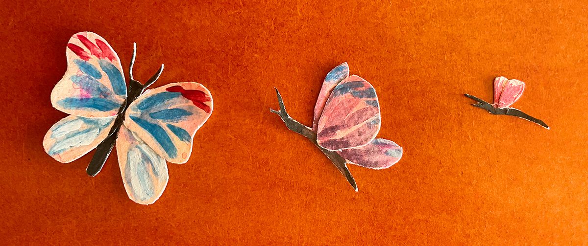 Tip #5: When glueing the butterflies onto the page, place the glue on the body and not on the wings so that the wings are not stuck down. This will create the impression that the butterflies are flying.