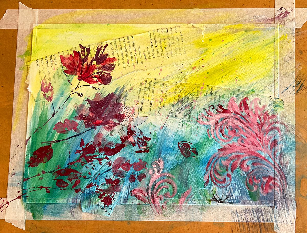 In my composition, I placed the flowers and leaves on the left side of the page and will use a floral stencil for the bottom right.