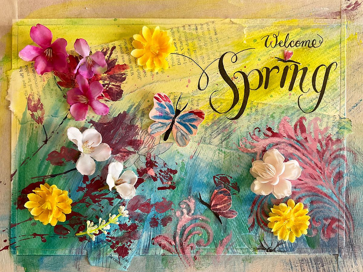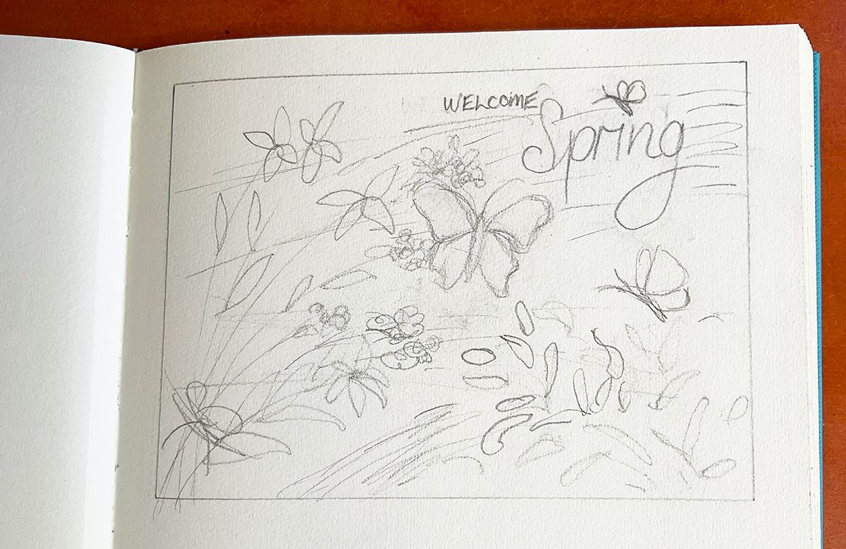 I visualized butterflies fluttering amongst the floral elements. The words ‘Welcome Spring’ is positioned on the top right of the page.