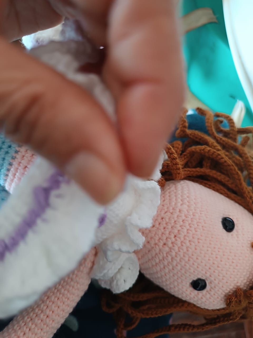 La muñeca tiene un estilo tierno y delicado, con detalles que resaltan en su vestimenta y accesorios. Los ojitos y perlitas le dan un acabado expresivo y brillante, mientras que la cinta de agua aporta un toque especial. Es un proyecto que combina paciencia, creatividad y mucha dedicación.