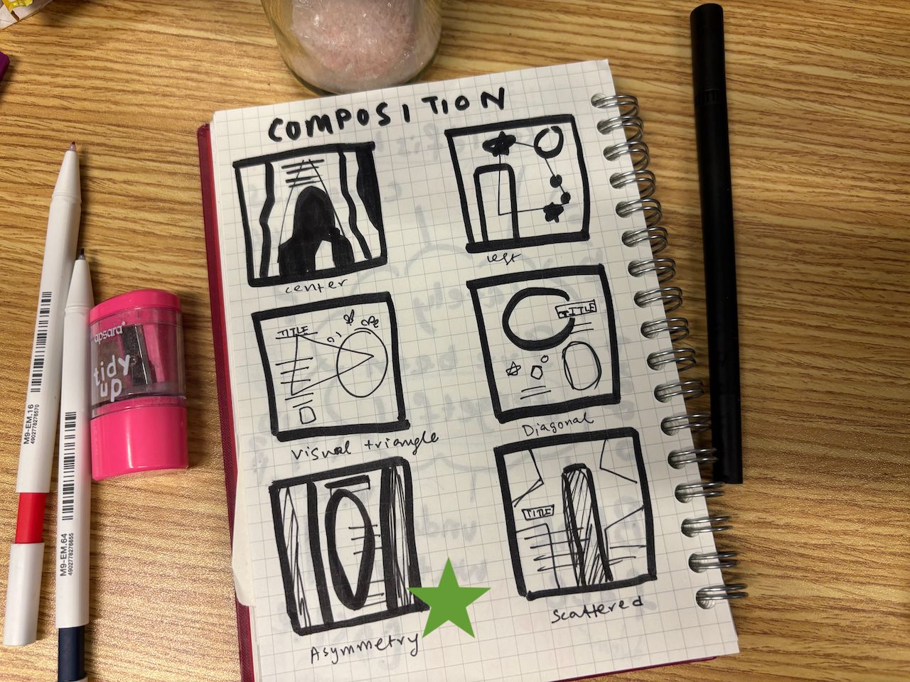 I drew six different compositions and decided to go for the asymmetry panel (marked with a green star) to symbolize chaos and claustrophobia in the feeling of forgetting.