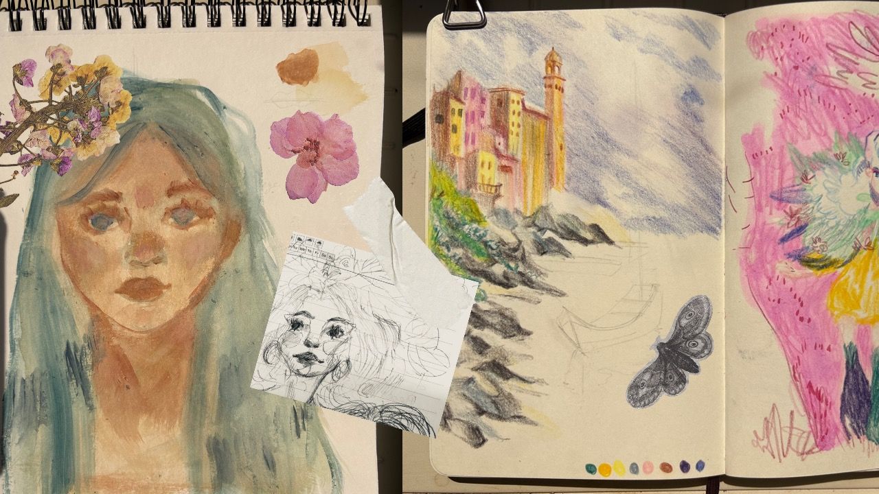 Papier akwarelowy i farby, szkicownik, ołówek, długopisy, suszone kwiaty, taśmy, szpilki i klipsy