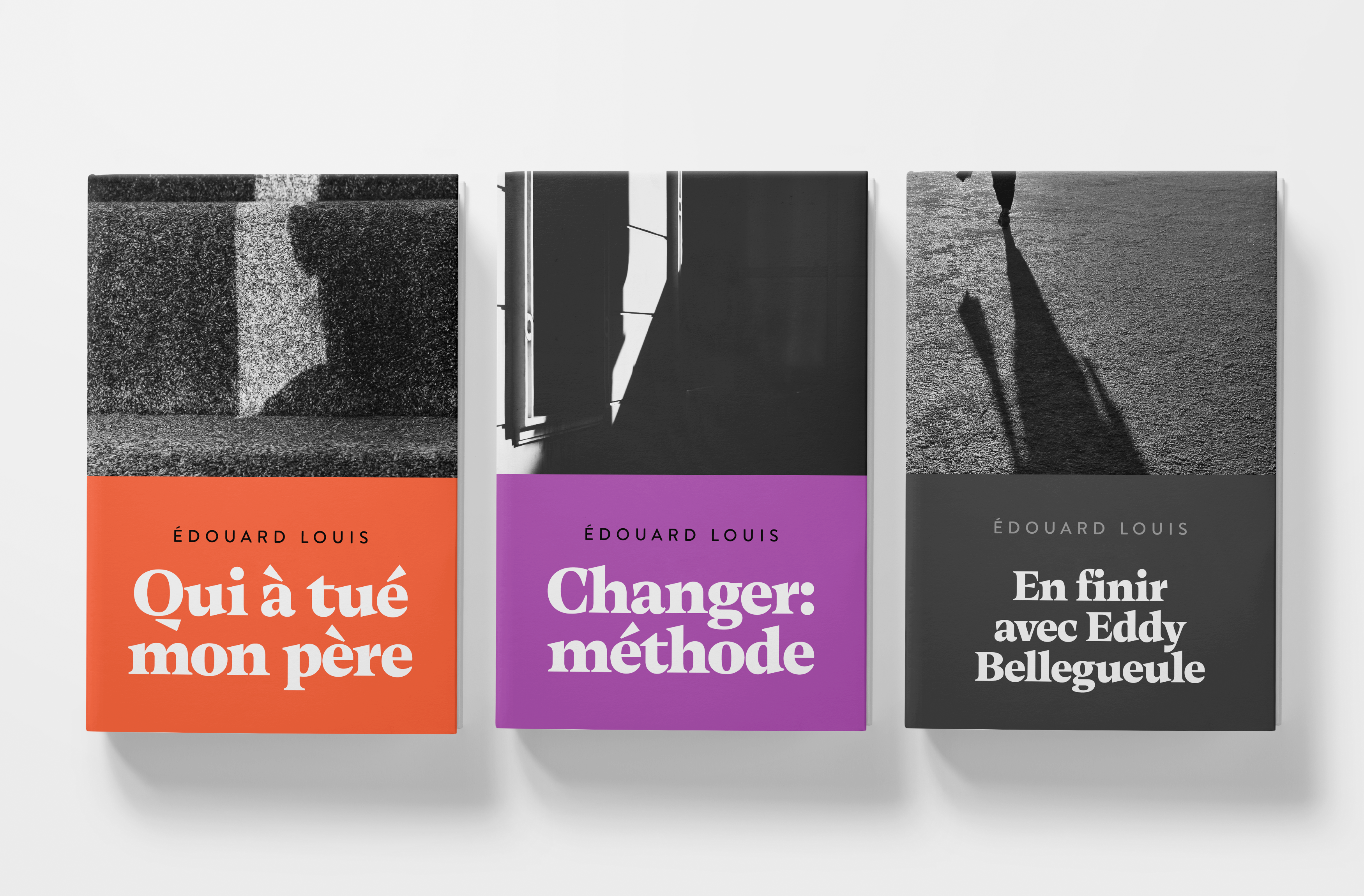 The colors picked for each cover reflect the subject matter; red-orange for the violence and anger in 'Qui à tué mon père', a violet for the attempts at sophistication in 'Changer: Méthode' and a dark grey for the death of the former self in 'En finir avec Eddy Bellegueule'.
