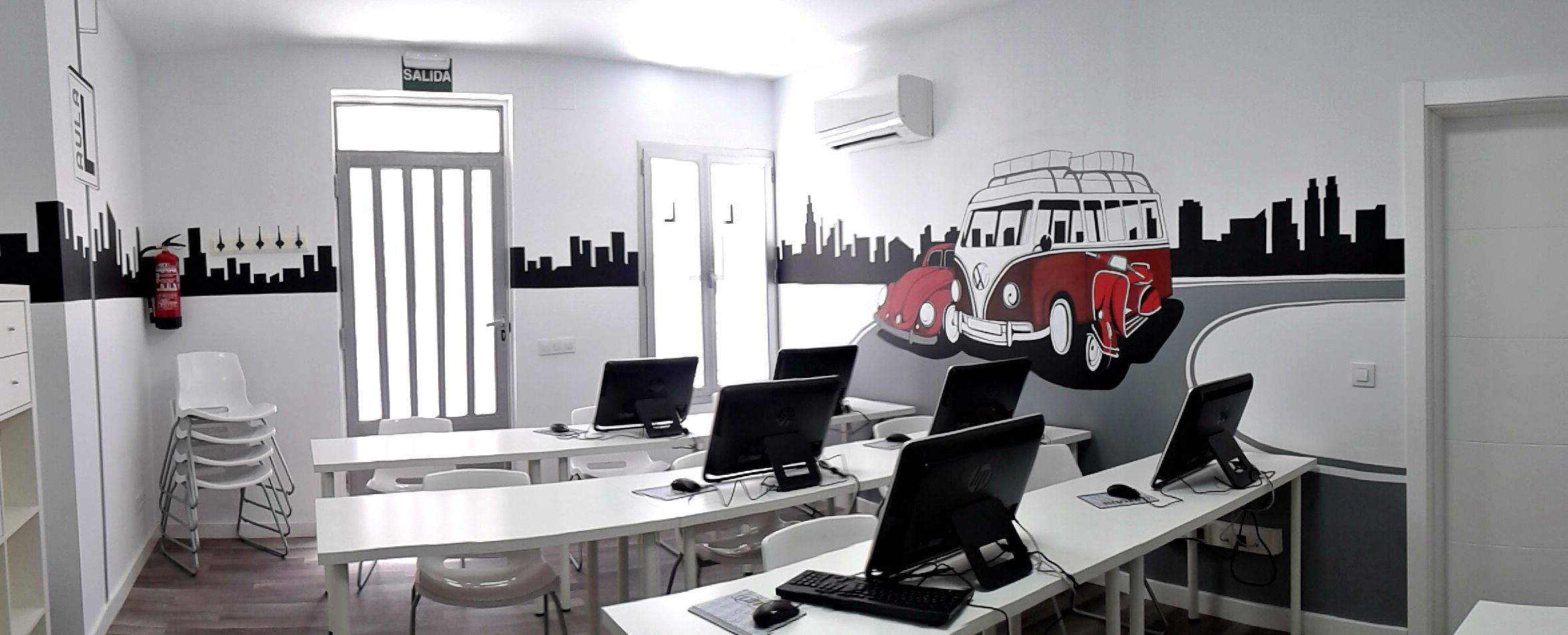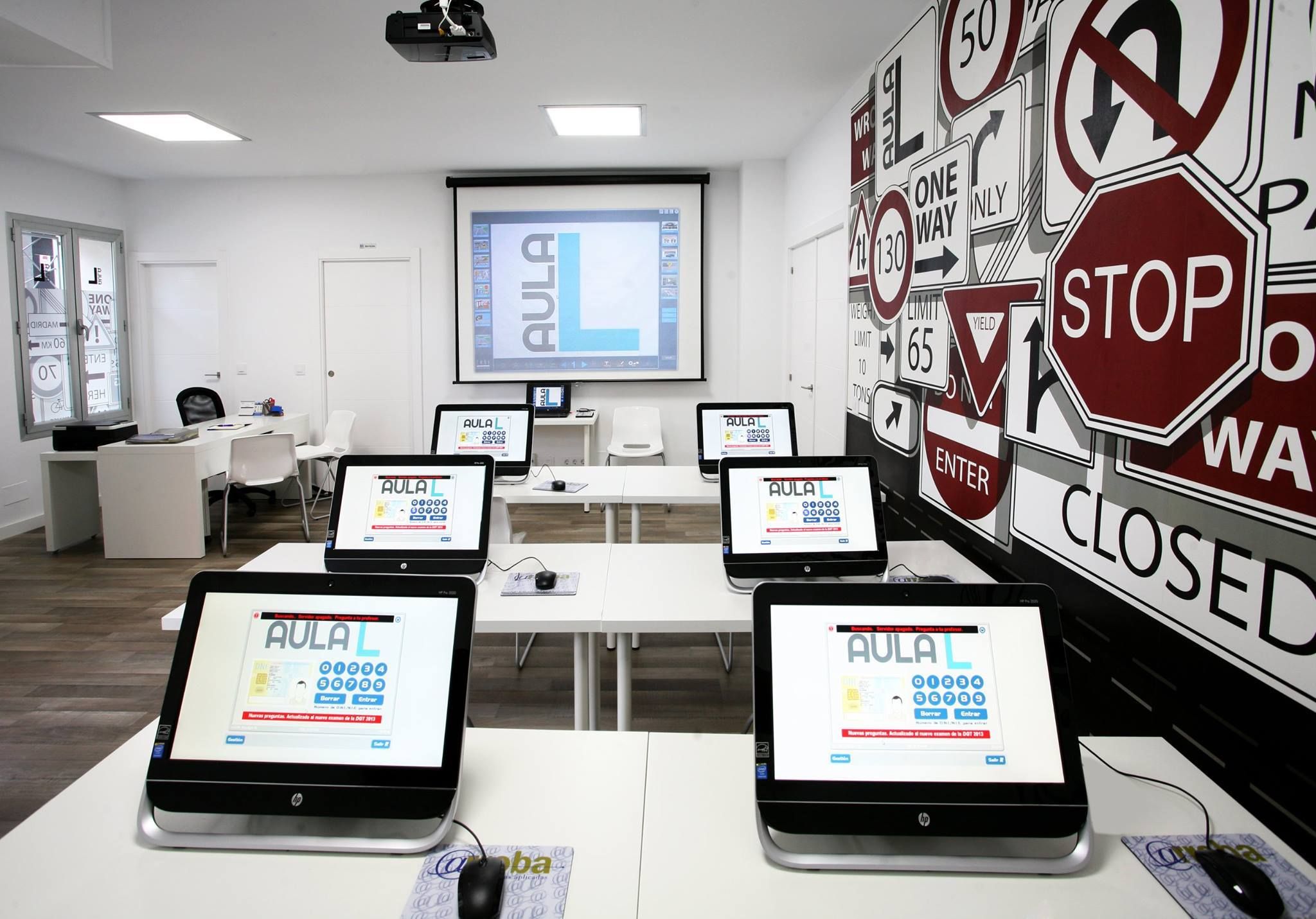 Diseño mural realizado para la autoescuela Aula L en Ejea de los Caballeros (Zaragoza). El diseño con las señales de tráfico está impreso en vinilo y el otro está dibujado y pintado directamente sobre el muro en blanco.