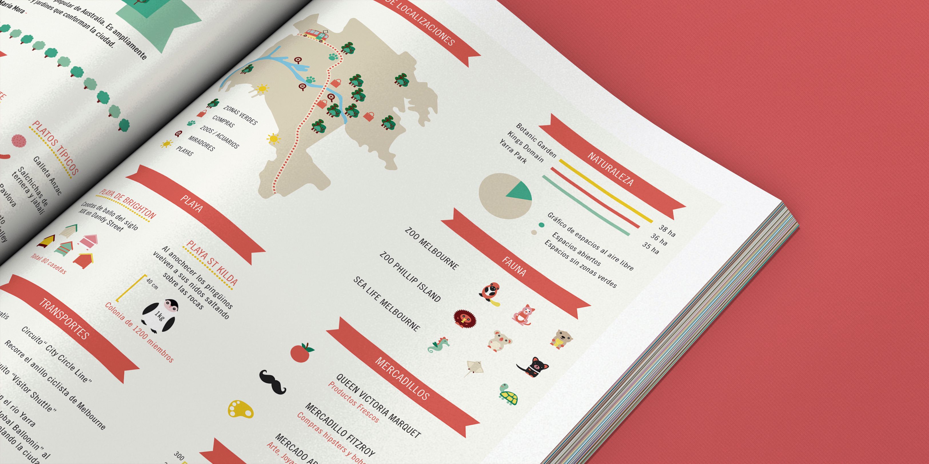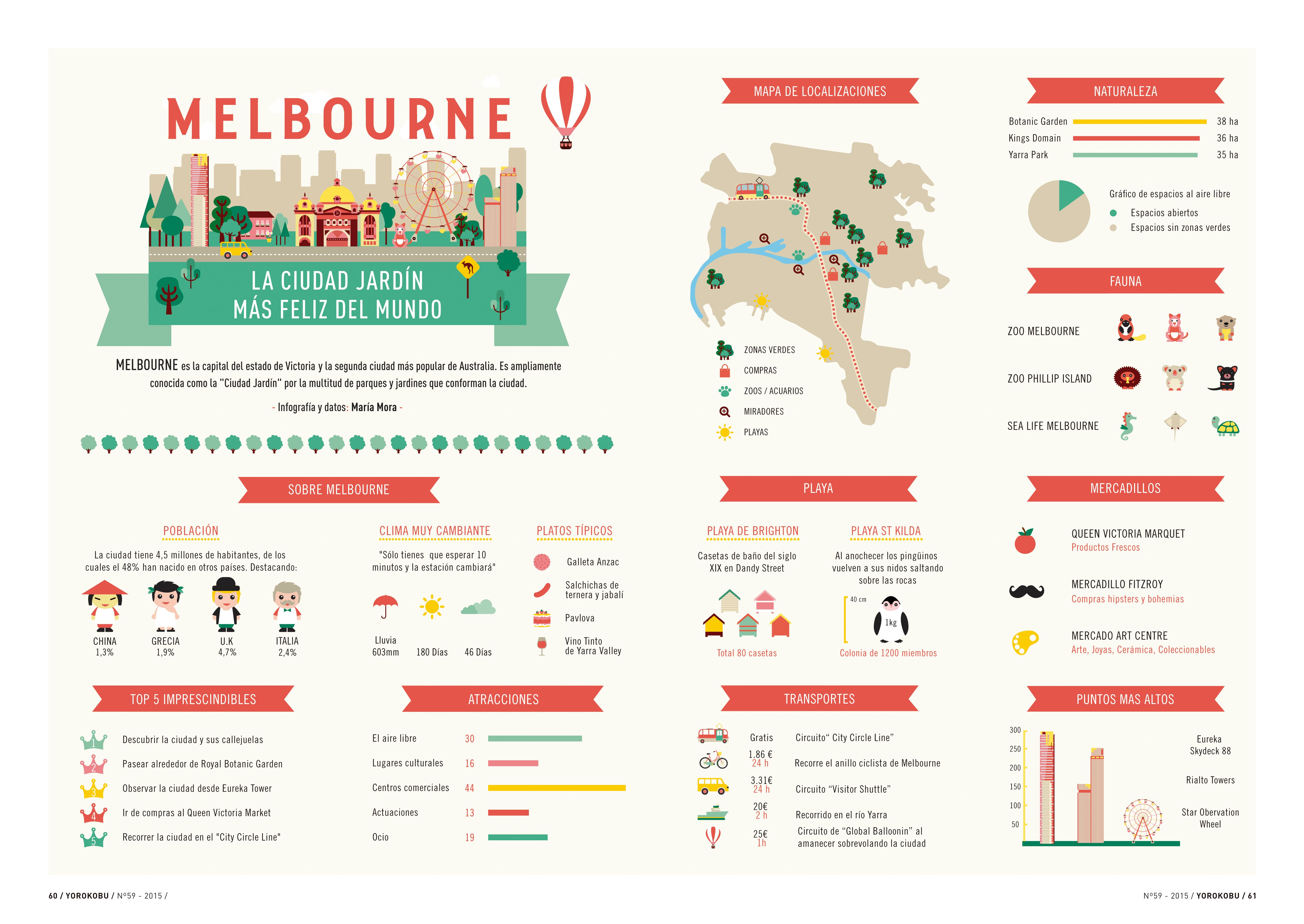 Melbourne es considerada la "Ciudad Jardín". El objetivo de esta infografía es proporcionar información sobre la ciudad y las actividades que se realizan al aire libre de una forma sencilla, amena y divertida.