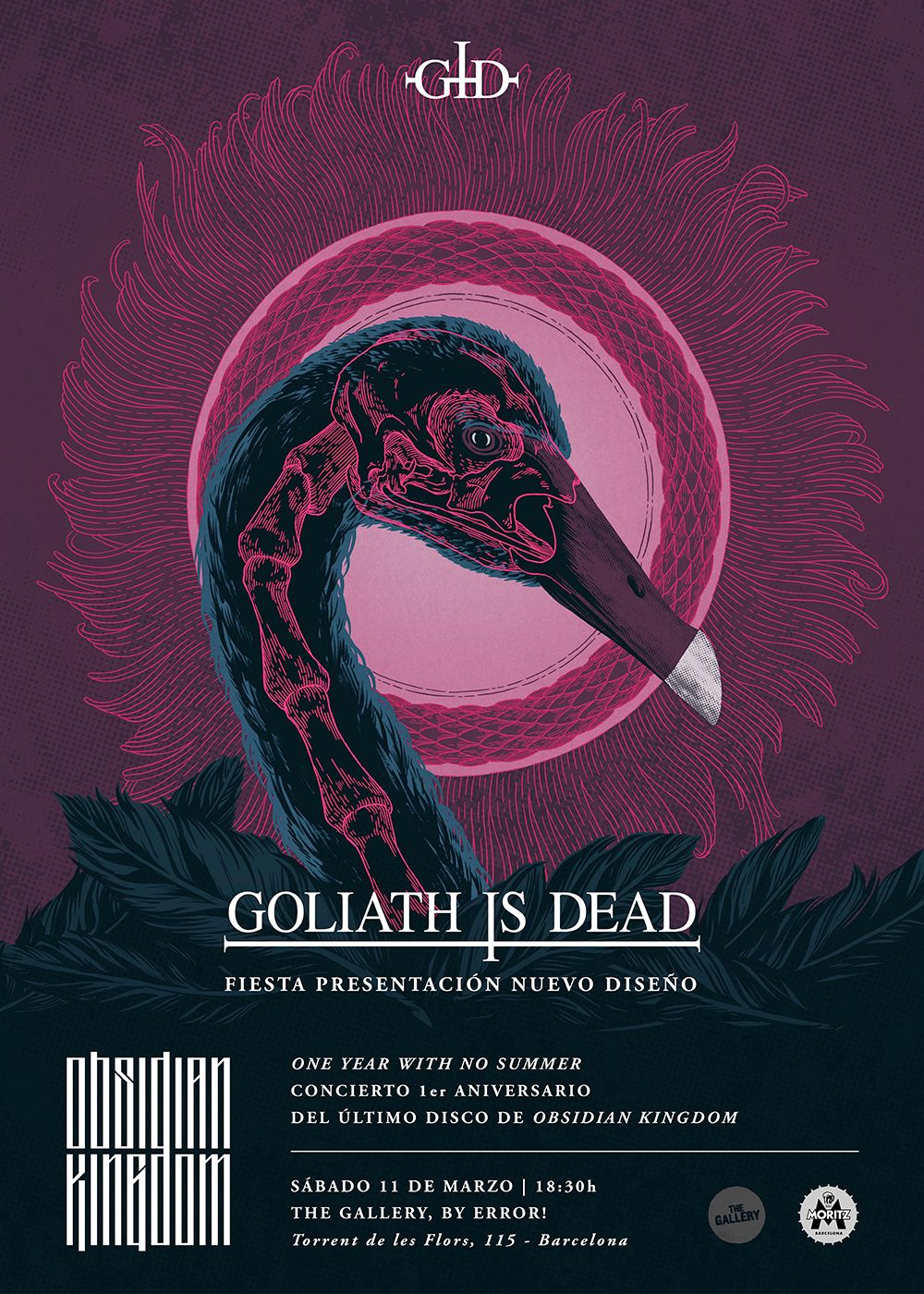 Cartel para la fiesta de presentación del nuevo diseño del blog Goliath Is Dead. La ilustración está inspirada en la canción "Black Swan" de Obsidian Kingdom, que ofrecieron una actuación especial para el evento.