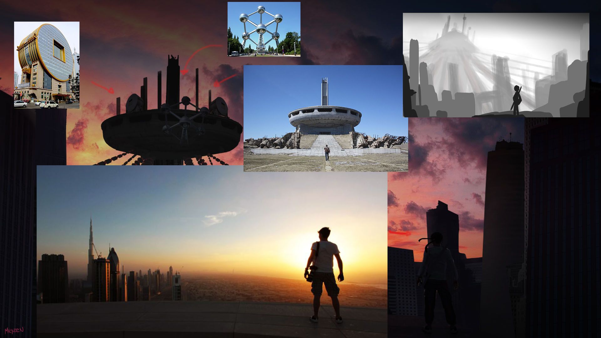 Moim zdaniem punkty skupienia i kierunek, jaki osiągasz po przekątnej między budynkiem centralnym a bohaterem, działają całkiem nieźle. Jeśli pozwolisz mi na sugestię: zmodyfikowałbym budynek po prawej stronie, jakoś trochę rozprasza po zejściu po przekątnej, może odsunie go trochę (jak na twoim szkicu), zgaszenie niektórych świateł lub zastąpienie go inną strukturę. Pozdrowienia