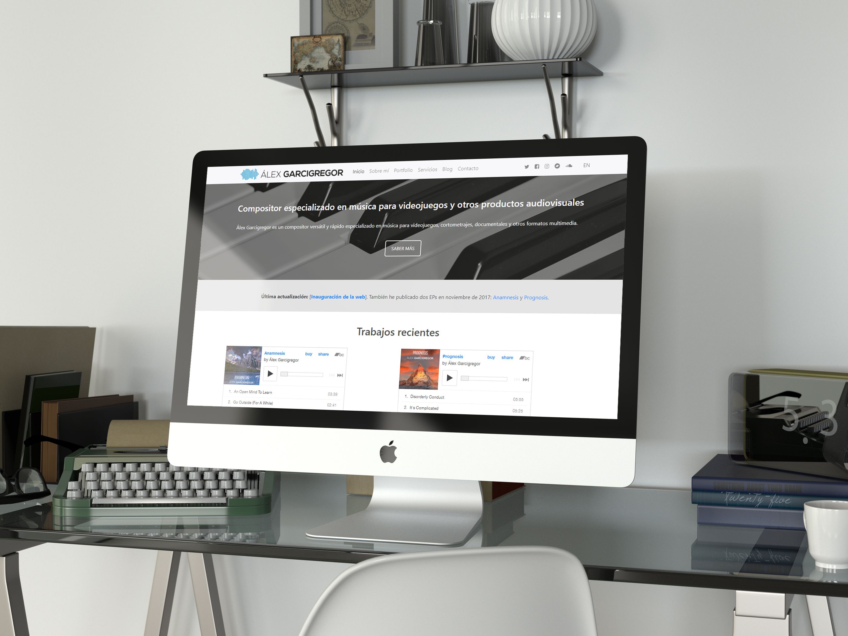 Diseño y desarrollo de una web profesional para el compositor de música para videojuegos y otros productos audiovisuales Álex Garcigregor. Se trata de una web destinada a presentar los servicios que ofrece como compositor musical, así como a servir de portfolio de sus proyectos hasta la fecha y como vía de contacto.