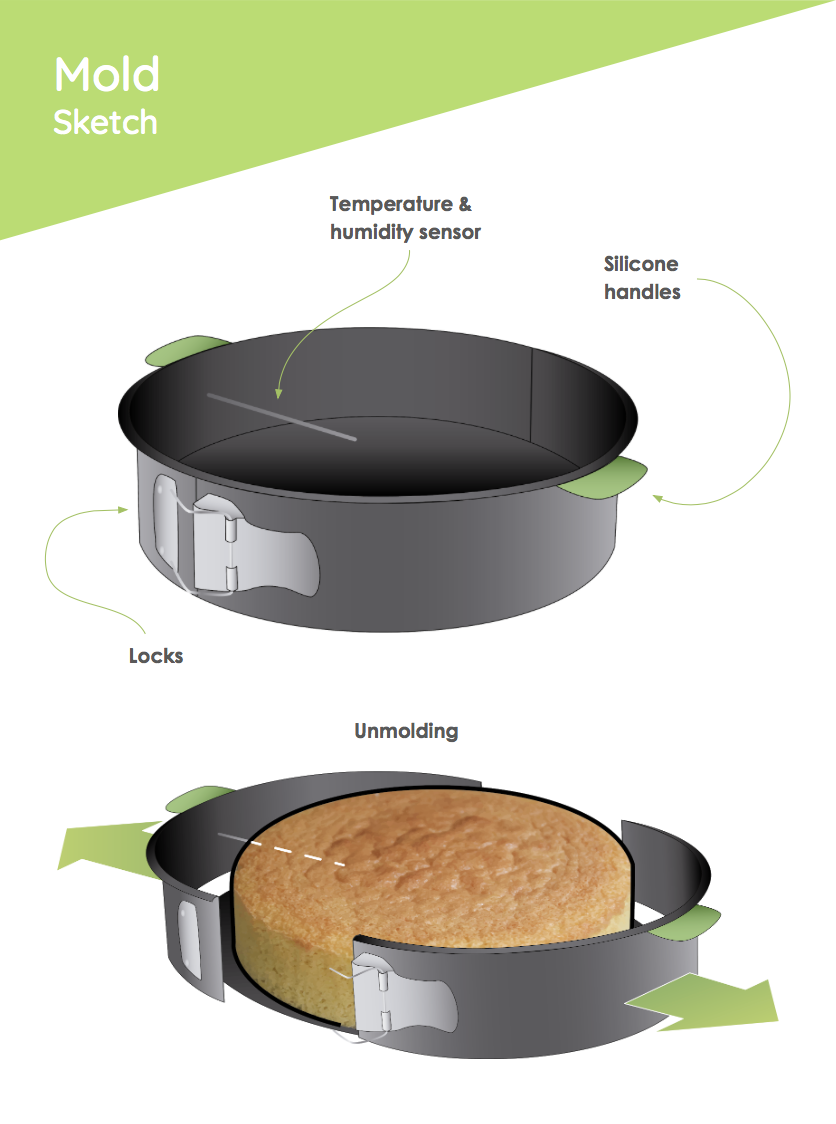 Concepto para el desarrollo de un molde conectado a una App, en la que se muestran recetas, se dan indicaciones sobre la preparación e información del estado del bizcocho o tarta. Gracias al conocimiento de la receta y a la gestión de las mediciones recibidas del sensor de temperatura y humedad, la calidad de los resultados culinarios aumenta y se facilita el proceso.