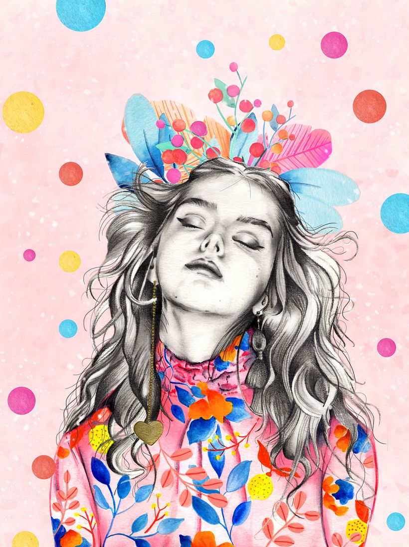 Ostatnim krokiem było przeniesienie całości cyfrowo do Photoshopa, aby wyretuszować pewne aspekty, które zostały utracone lub zmienione podczas skanowania, takie jak rozjaśnienia i bardziej stonowane kolory. W ten sposób dopracowano poziomy, nasycenie i inne aspekty, a także niektóre detale, na przykład, w moim przypadku, dodanie większej ilości luźnych włosów. Pracowałem również nad tłem, które stworzyłem za pomocą cyfrowych pędzli i akwarelowych plam, które wcześniej zrobiłem na papierze.