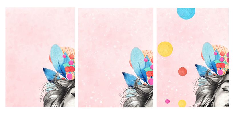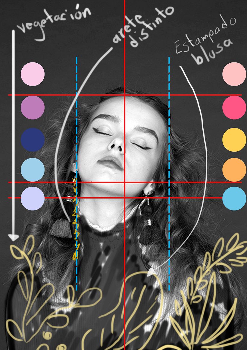 - Mi imagen inicial cambio un poco debido a que durante el desarrollo me di cuenta que el estampado ya era bastante llamativo por si mismo y colocar más elementos cercanos haría lucir esa parte sobresaturada.