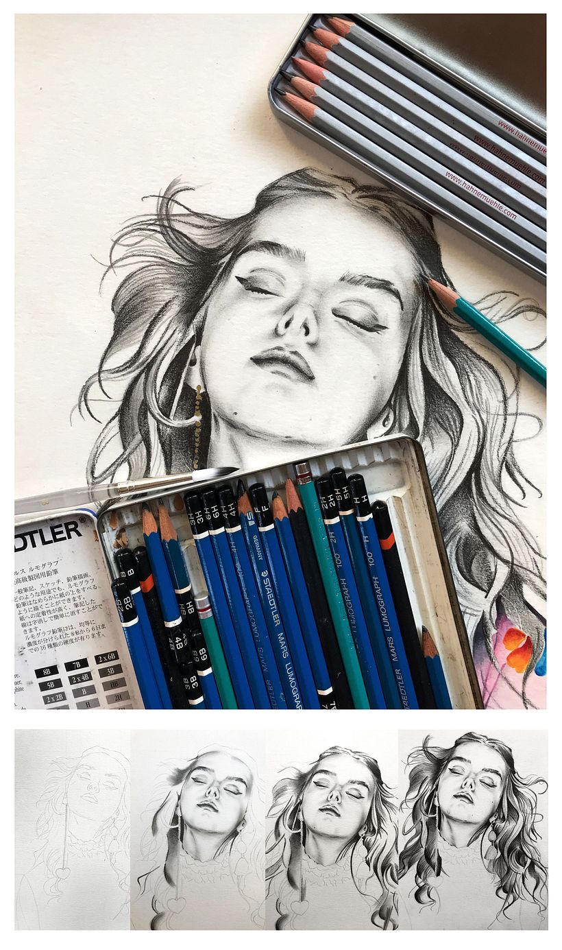Później przeszliśmy do pracy nad portretem ołówkowym, zaczynając od szkicu uzyskanego techniką, która miała na celu uzyskanie proporcji najlepiej pasujących do Twojej pracy lub łatwiejszych do wykonania, wszystko ołówkiem H lub z tej grupy, po prostu do zdefiniowania konturów, aby następnie przejść do cieniowania, które zaczęło się od najciemniejszych cieni, używając miękkich ołówków (użyłem 4B, 6B, 8B), następnie do średnich przy użyciu kilku ołówków pośrednich (B, HB, a nawet użyłem 6H) i na koniec na szczegółach, takich jak drobne włosy i pieprzyki na moim portrecie, a także światła, które zostały usunięte za pomocą gumki.