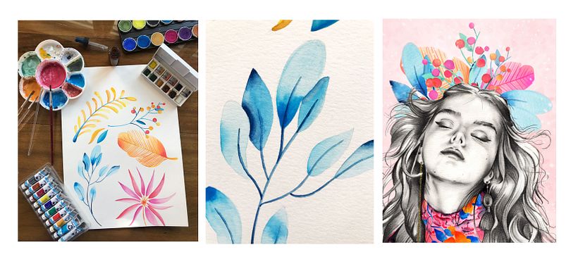 W bardziej osobisty sposób zdecydowałem się również dodać trochę roślinności, liści i gałązek, które uzupełniłyby portret, nad którym pracowałem przy użyciu akwareli, aby stworzyć rodzaj korony lub ozdoby głowy dziewczyny.