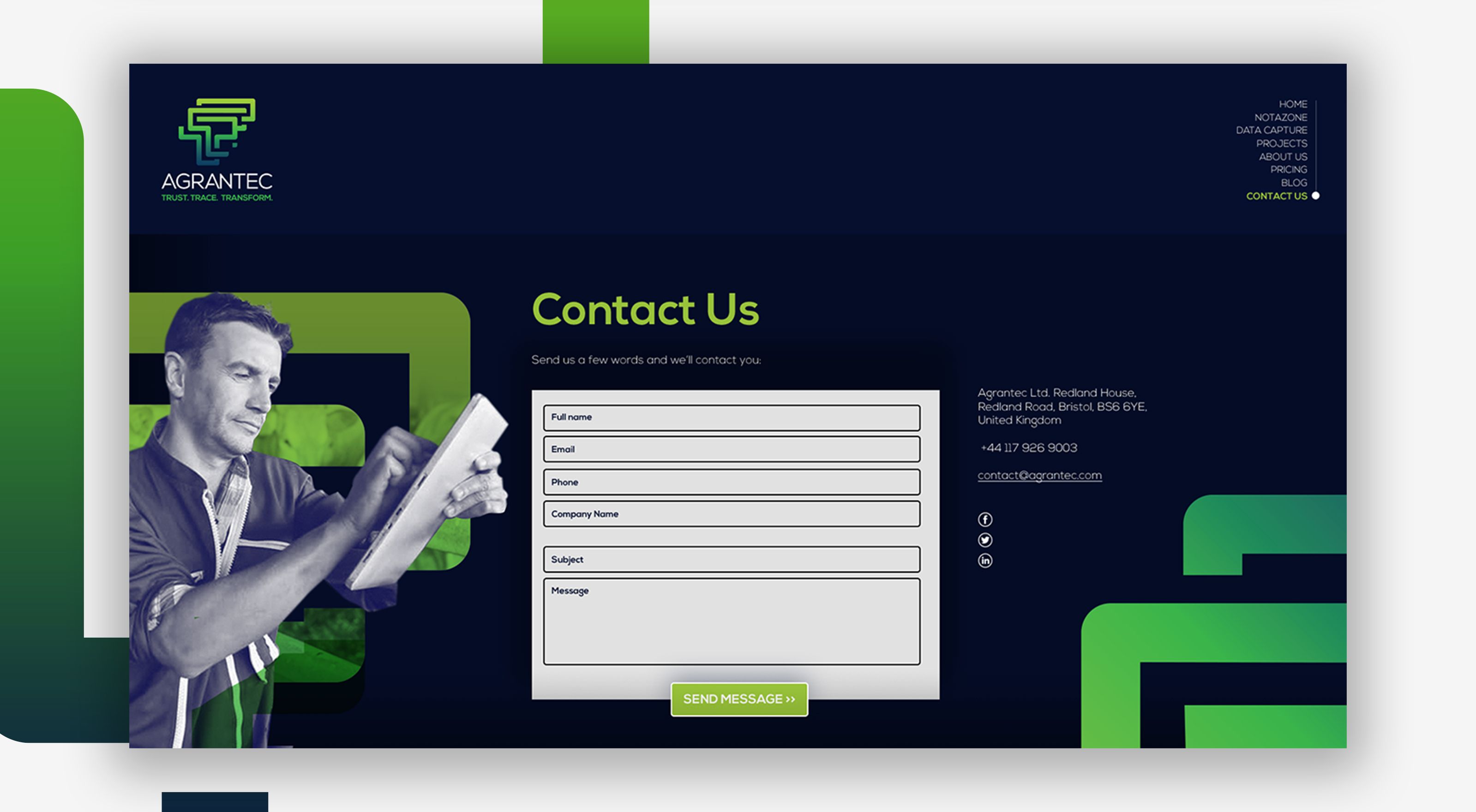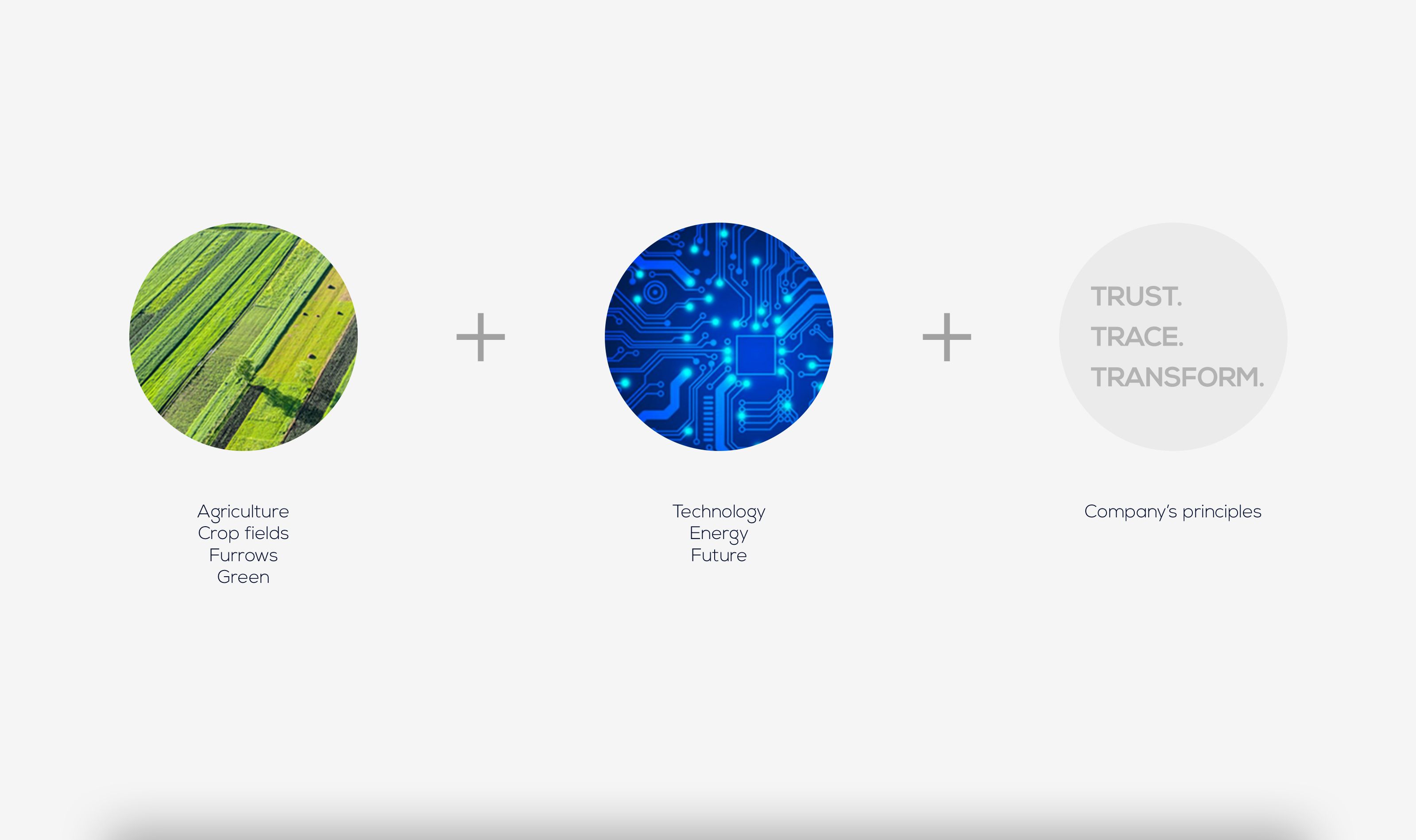Concepto: Combinar Agricultura y tecnología. Representar los 3 elementos del slogan: Trust. Trace. Transform