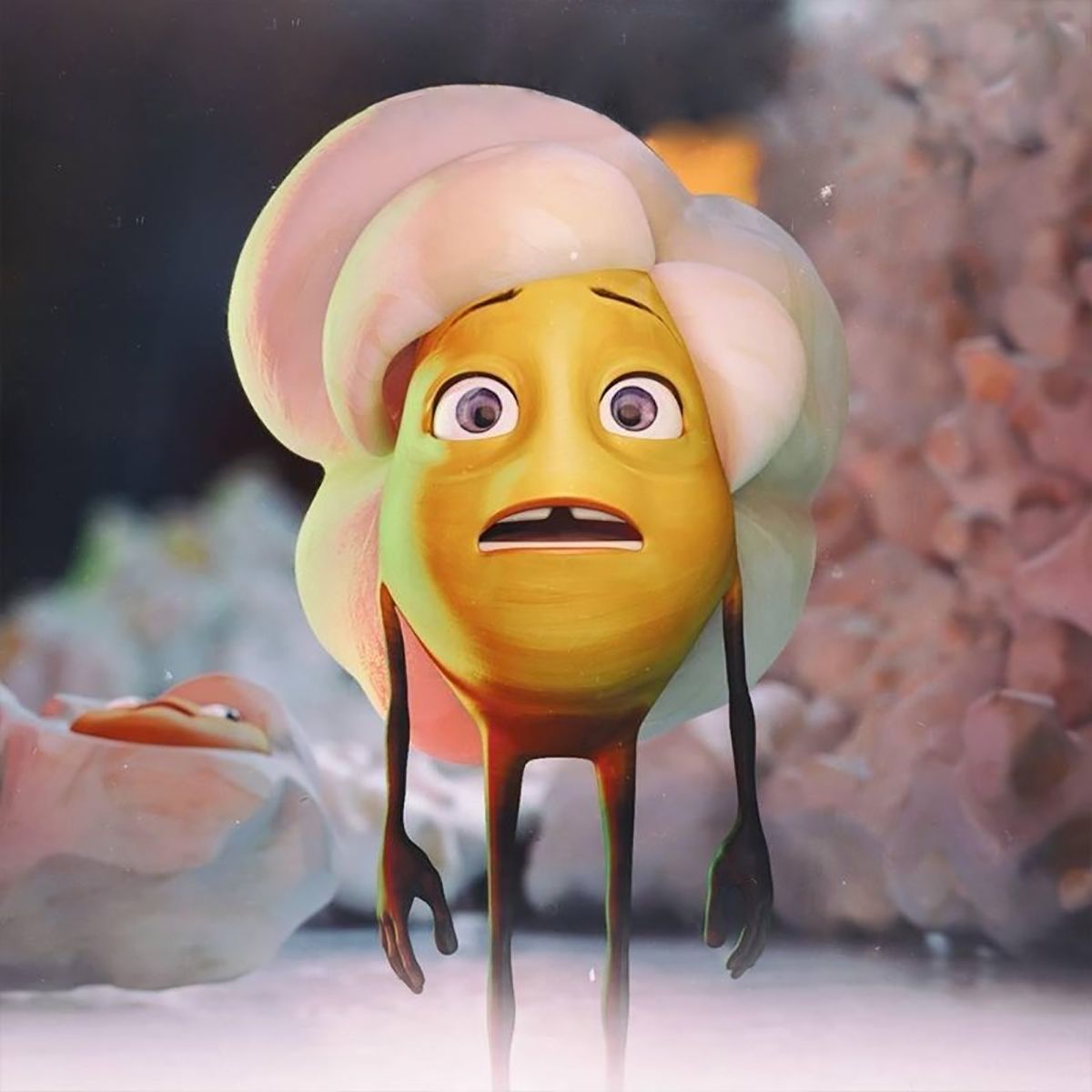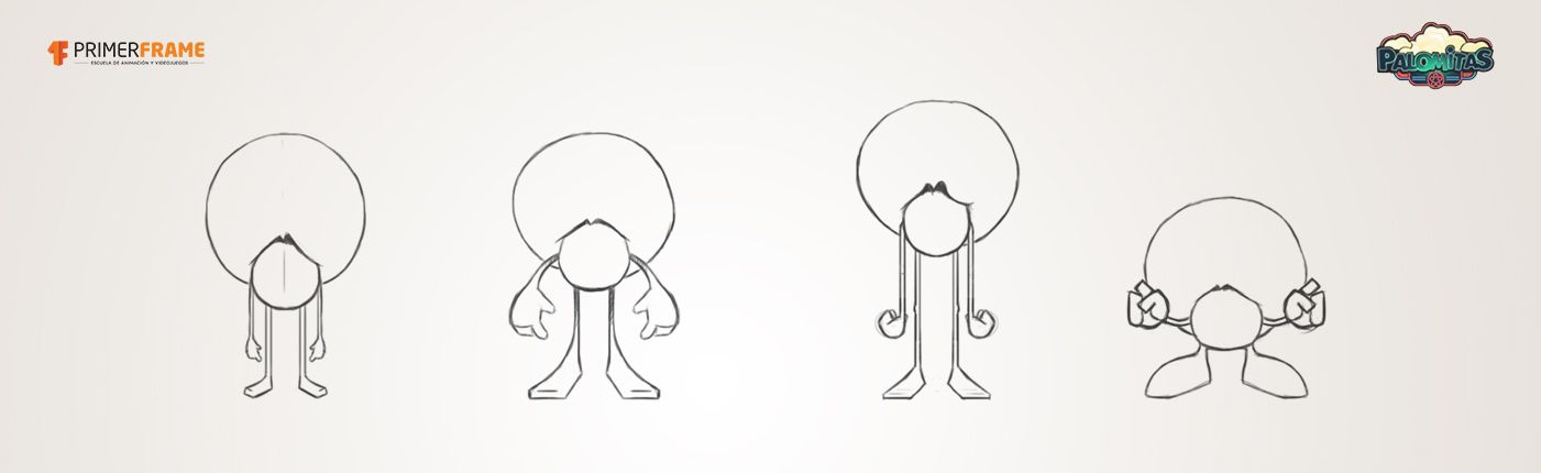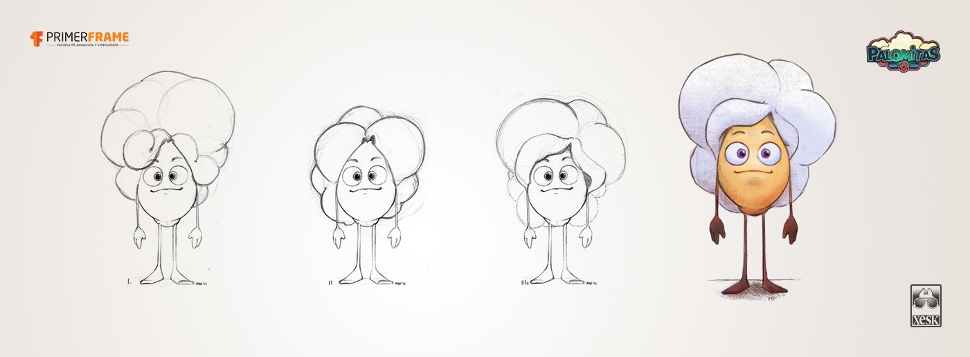 Después de analizar palomitas reales y de varios braistorming, se decidió partir de una base rígida que contendría la cara del personaje y a la que irían conectadas las extremidades. La masa blanca de la palomita cubriría el resto del cuerpo de forma que funcionara como pelo.