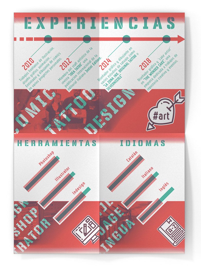 Breve currículum gráfico diseñado a 2 tintas, más un tercer color por sobreimpresión. También se trataron los calados y reventados. Originalmente pensado para un folleto de 8 pliegos en cruz.
