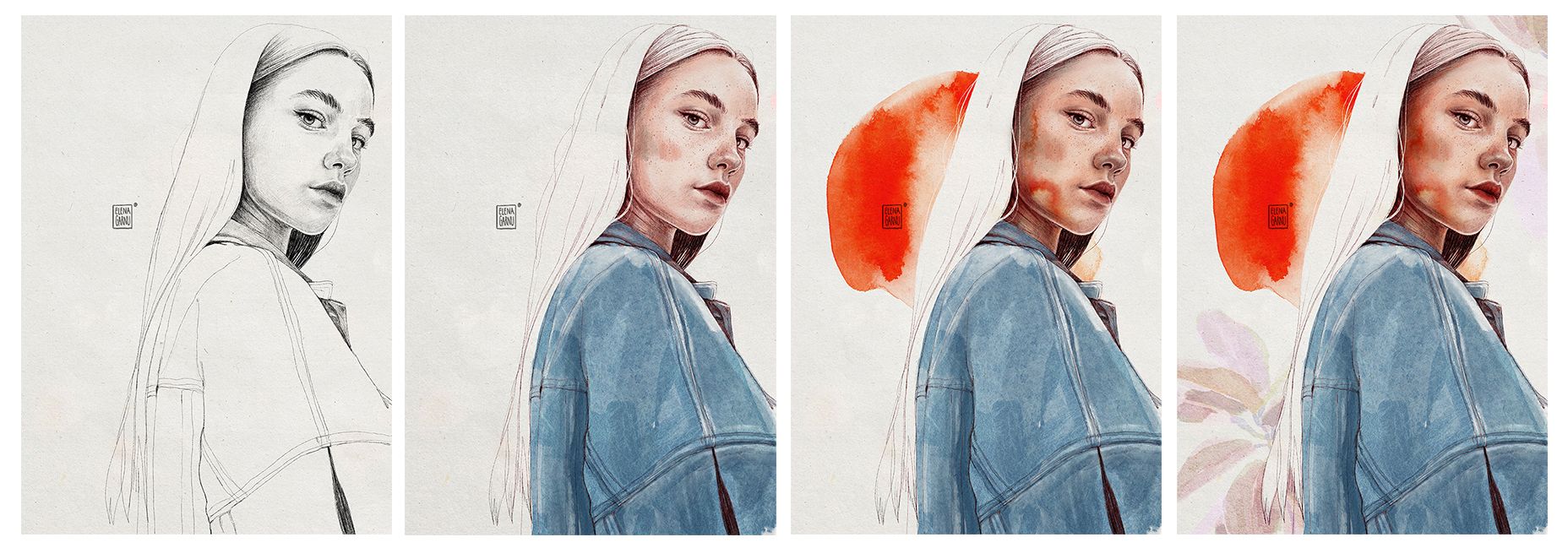 Pasos que sigo para llegar al resultado final. Trabajo realizado en Procreate con IPad Pro.