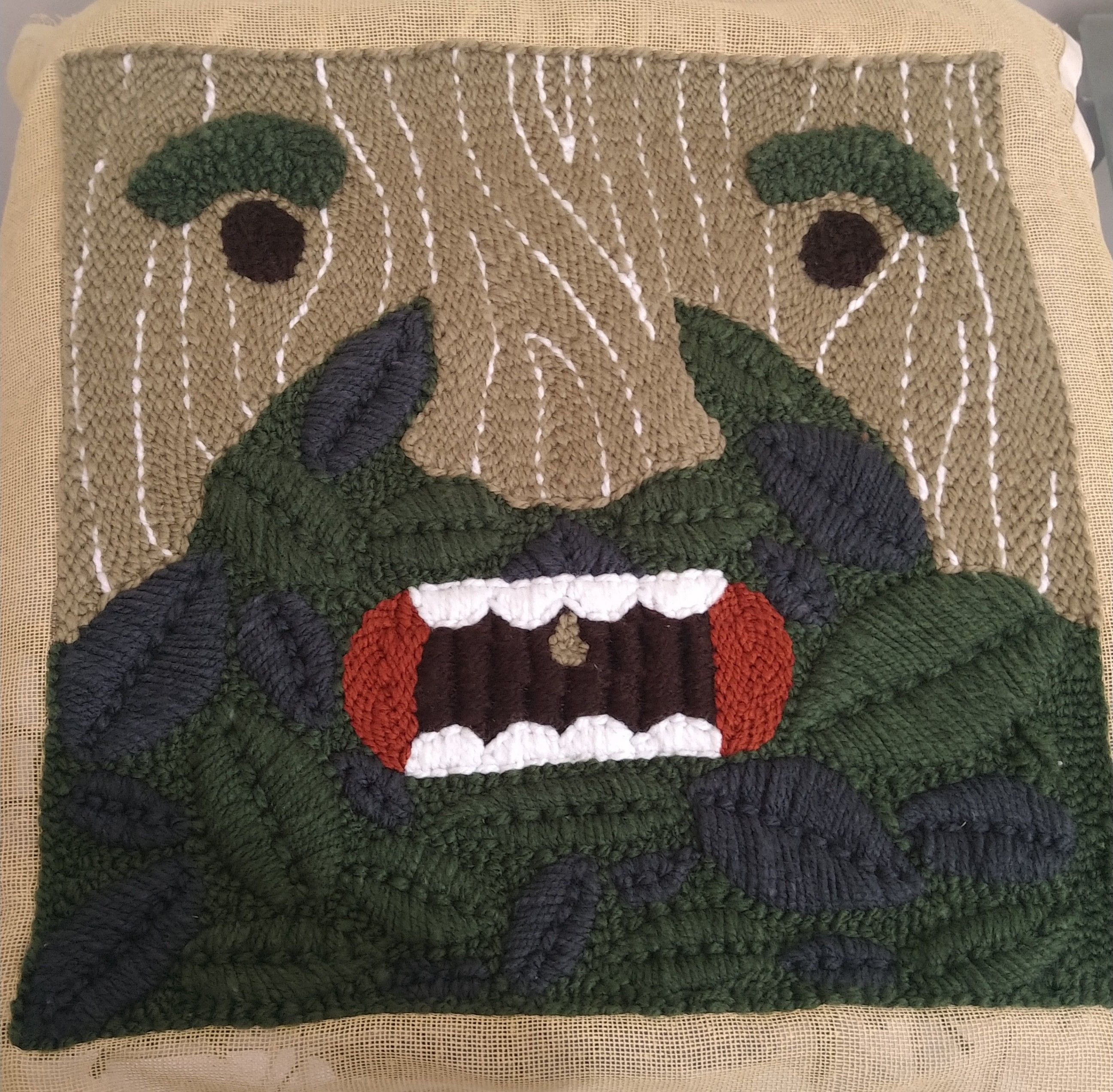 Comparto mi barbudo verdiazul. Muchas gracias por las lecciones, Caro, realmente fue fácil guiarse y terminar el proyecto, quizá lo más complicado fue conseguir la aguja y el bastidor gigante, de ahí en fuera todo fluyó bien.