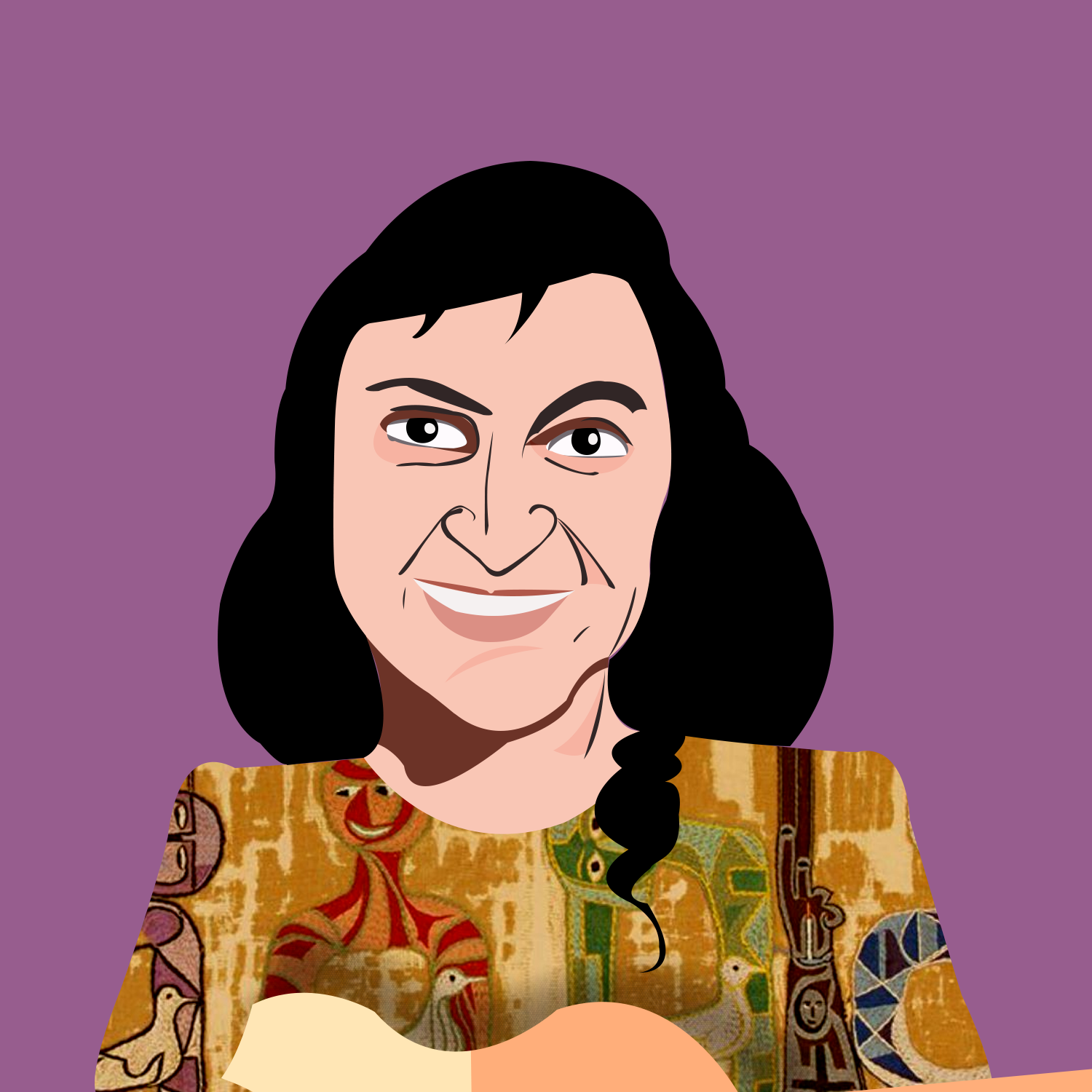 Violeta vestida con su arpillera "contra la guerra" que sintetiza su discurso pacifista.