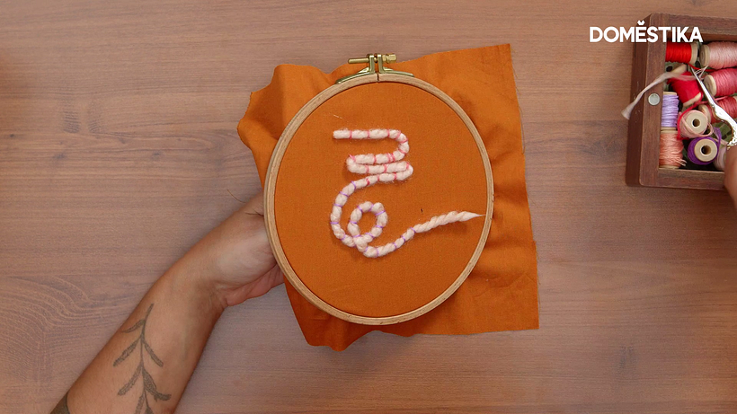 Em curvas, faça pontos mais próximos para garantir que a linha de lã ficará no lugar. E para criar preenchimento, basta dobrar a linha de lã e continuar o bordado.