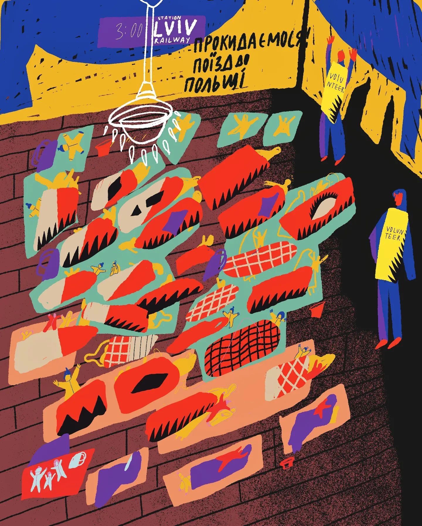 Nesta obra, mostra uma estação de trem onde mulheres se reuniram com seus filhos em busca de segurança, formando um "tapete" de maternidade e proteção.