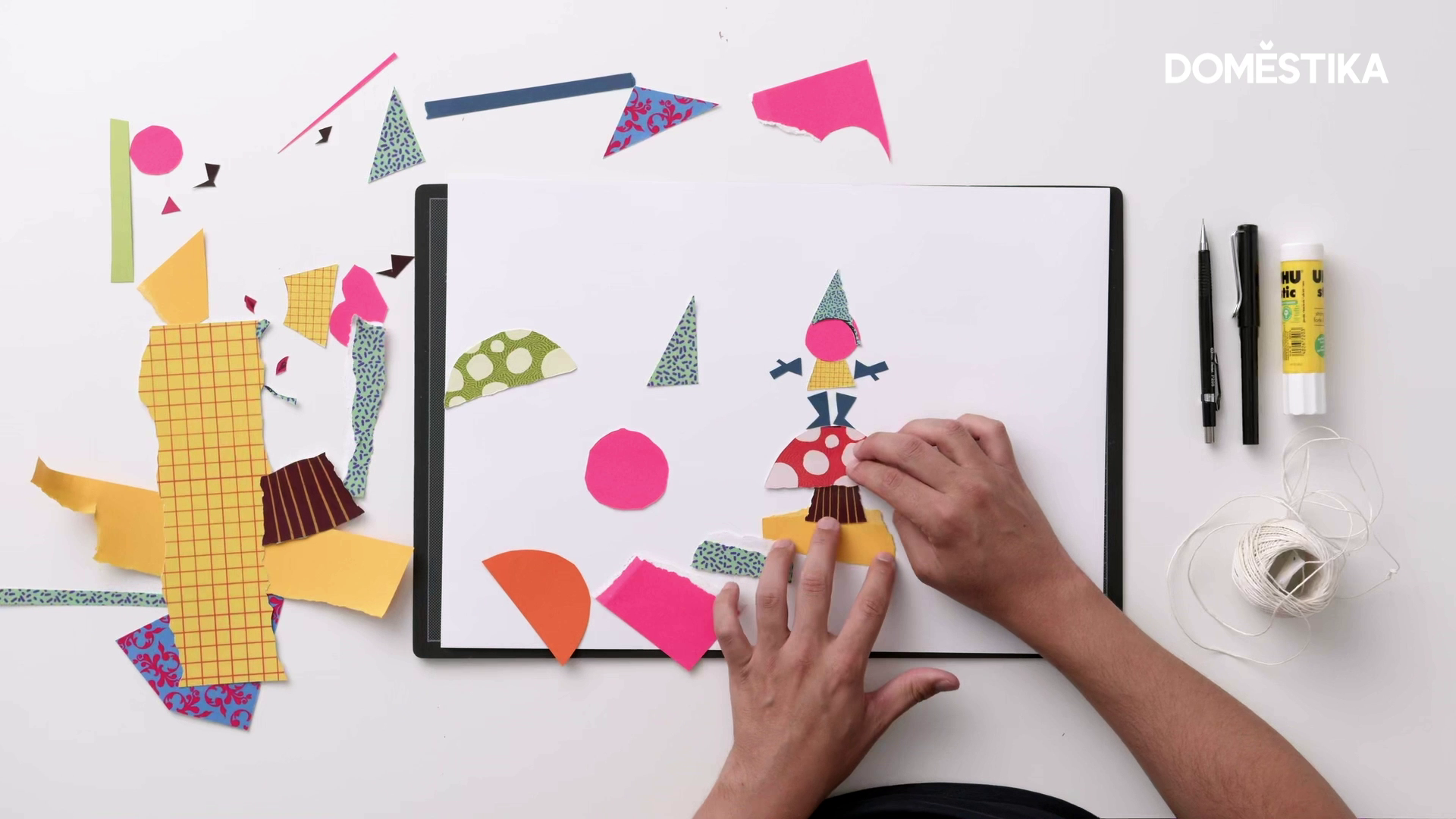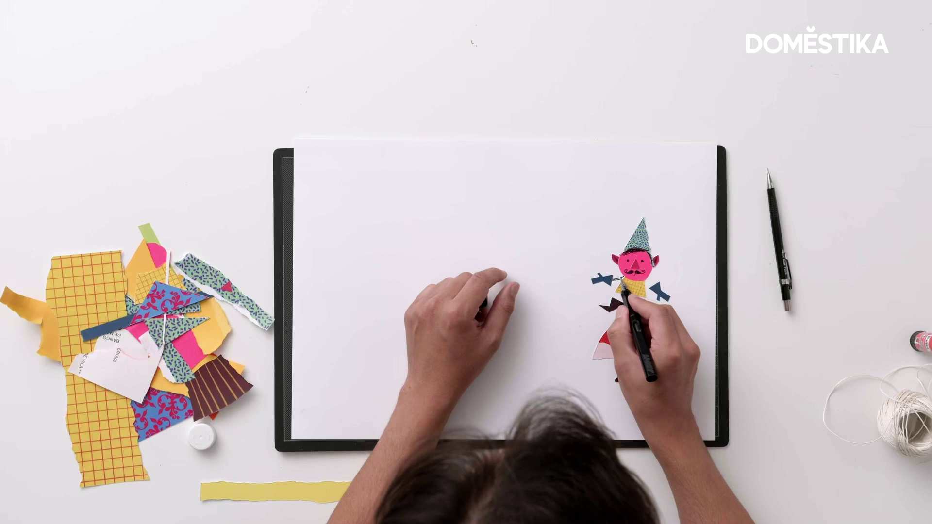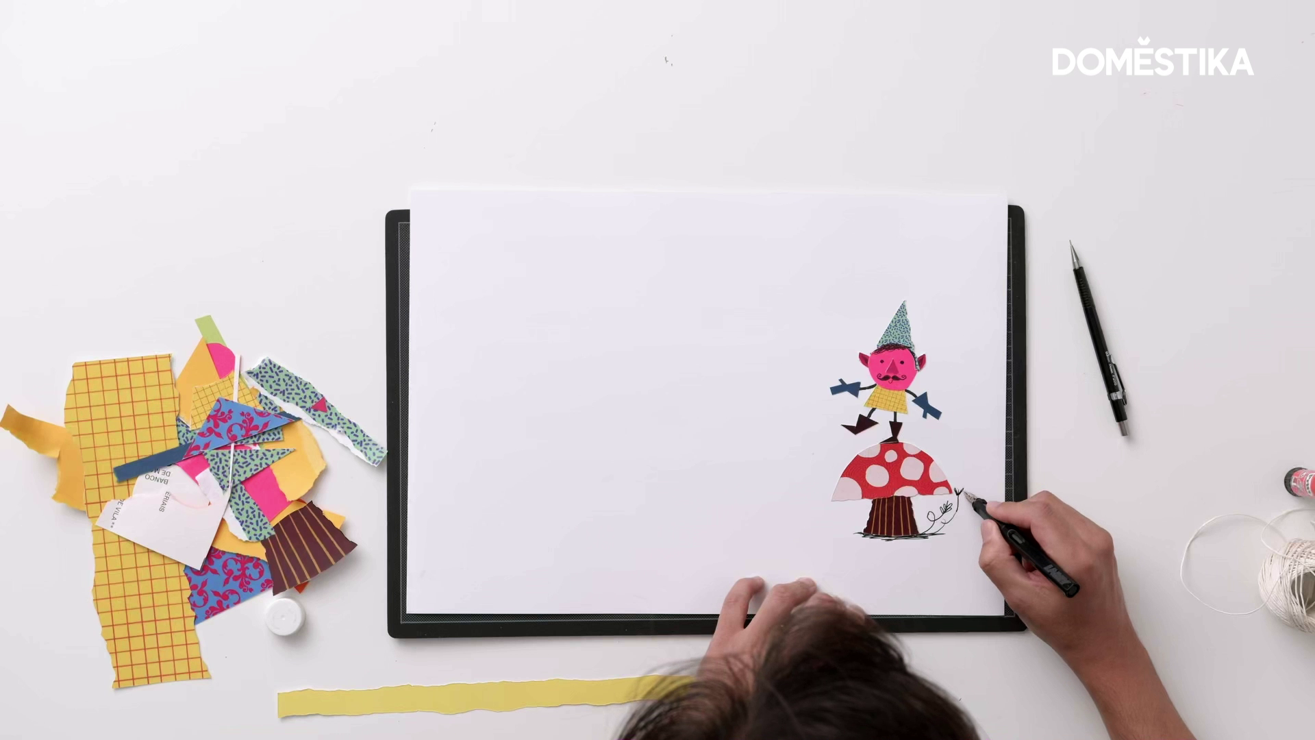 Durante a colagem, pense em formas básicas para criar um desenho diferente do que está acostumado a ver e fazer. Junte os pedaços que escolheu e comece a acrescentar detalhes com outras técnicas como canetas ou grafite.