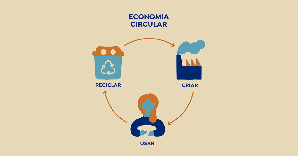 A economia circular é uma estratégia que visa reduzir tanto a entrada de materiais quanto a produção de resíduos virgens. Através da economia linear, o que fizemos até agora foi extrair, criar e jogar fora, e o que a economia circular propõe é criar, usar, reciclar.