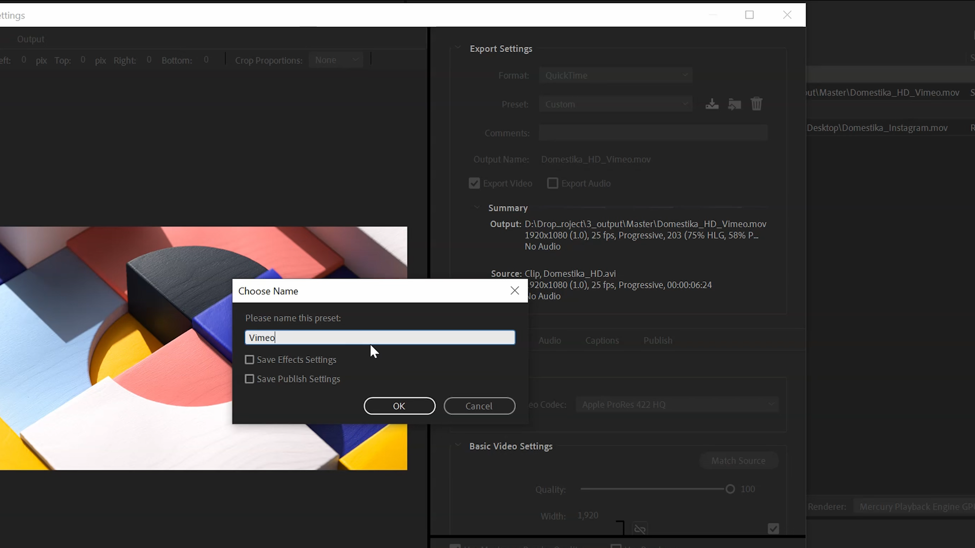 4. Para ajustar as configurações de exportação, clique no Preset (no caso da animação para o Vimeo, Apple ProRes 422 HQ) que selecionou antes.
