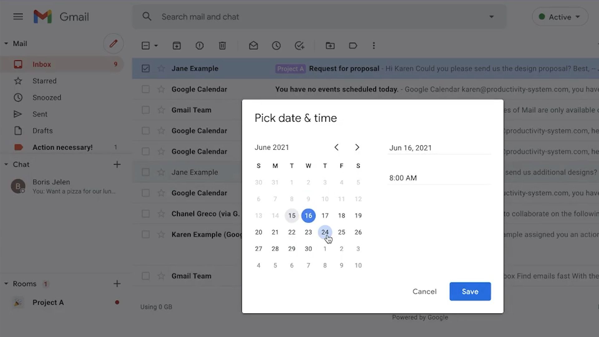 Você pode, então, visualizar as opções para programar a data e a hora em que ela reaparecerá em sua caixa de entrada. Chanel salienta que, se quisermos ver essas mensagens a qualquer momento, basta clicar na opção Suspensos no menu à esquerda da tela.